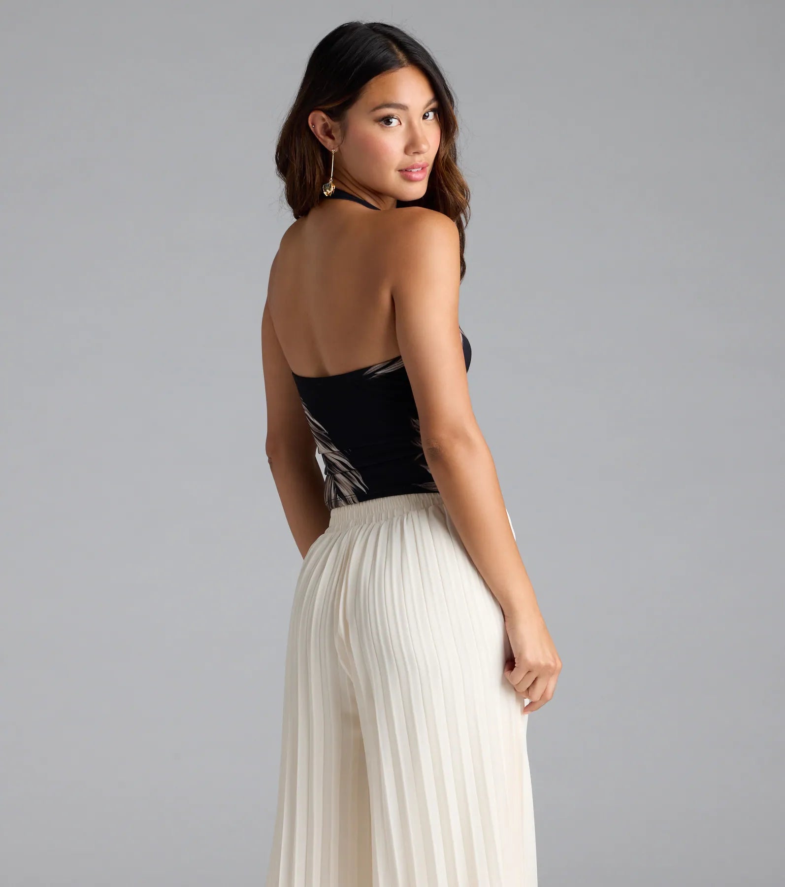 Show off your beauty on your next vacay in this sleek knit halter top with a trendy O-ring bust accent and an alluring tropical palm leaf print.