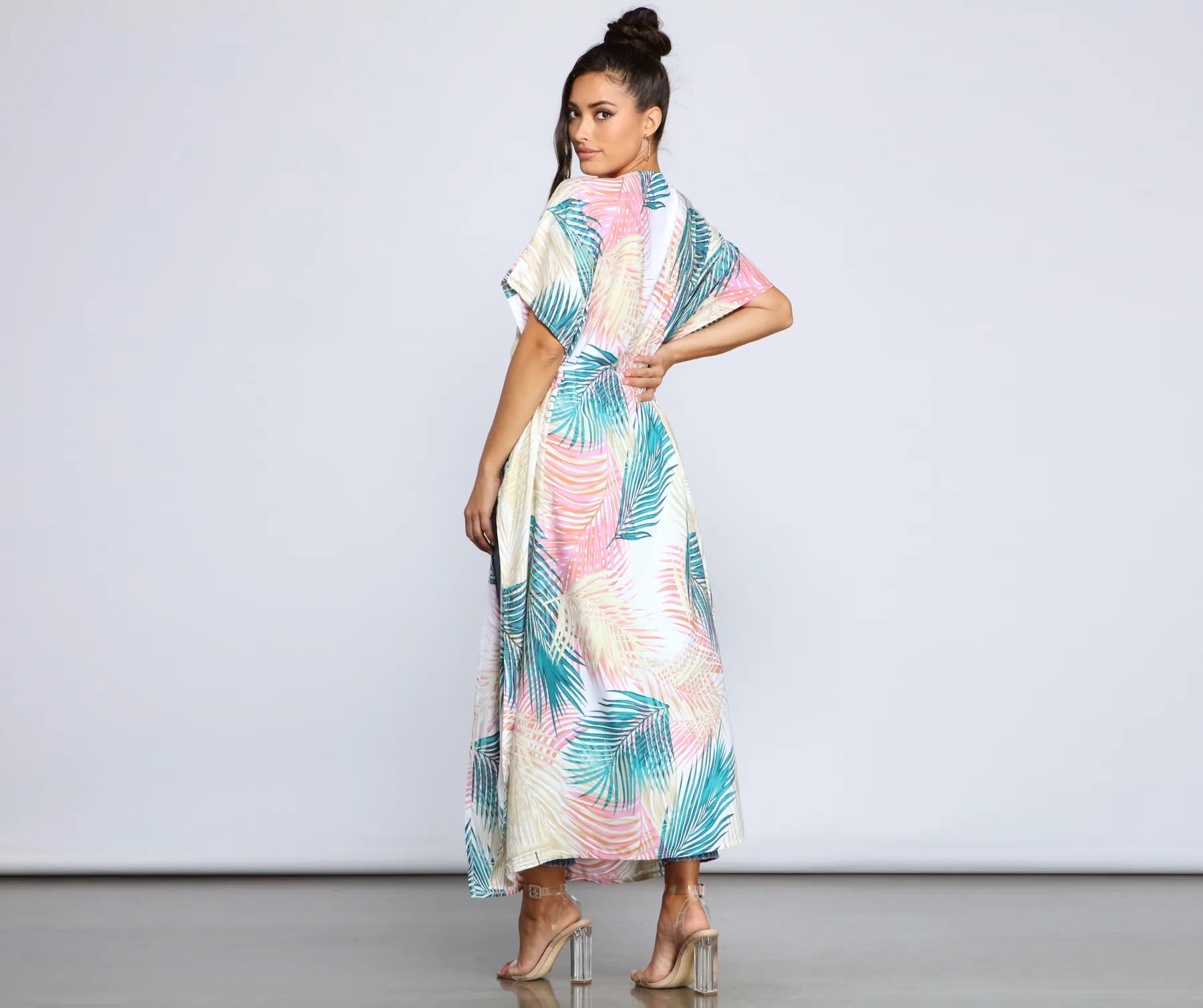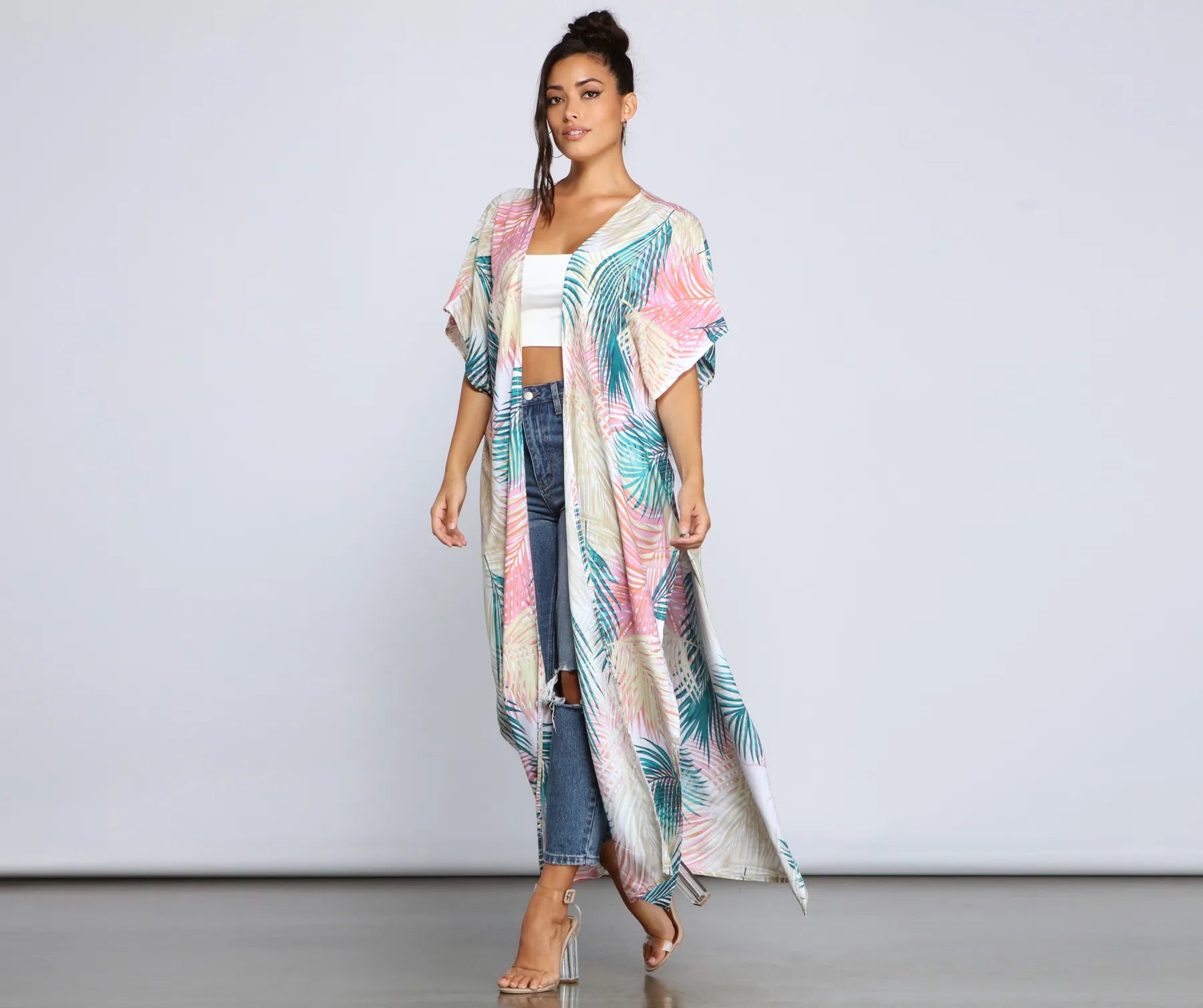 Set off on that dream vacay with a chic duster! The lightweight duster is perf to layer over your beachside looks or styled for a . The duster features a vibrant palm leaf print. kimono sleeves. a tie waist belt. and a flowy long length.?