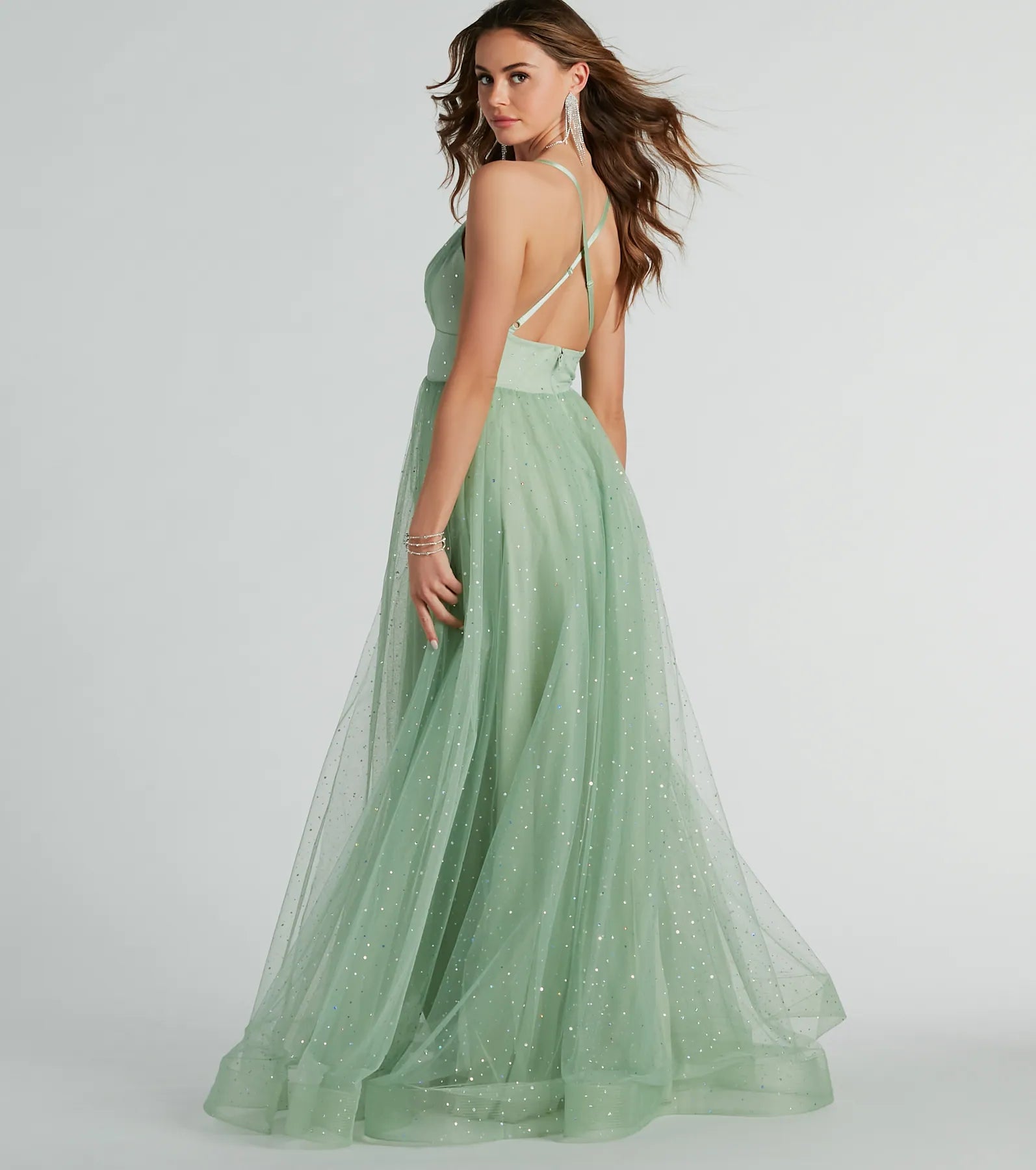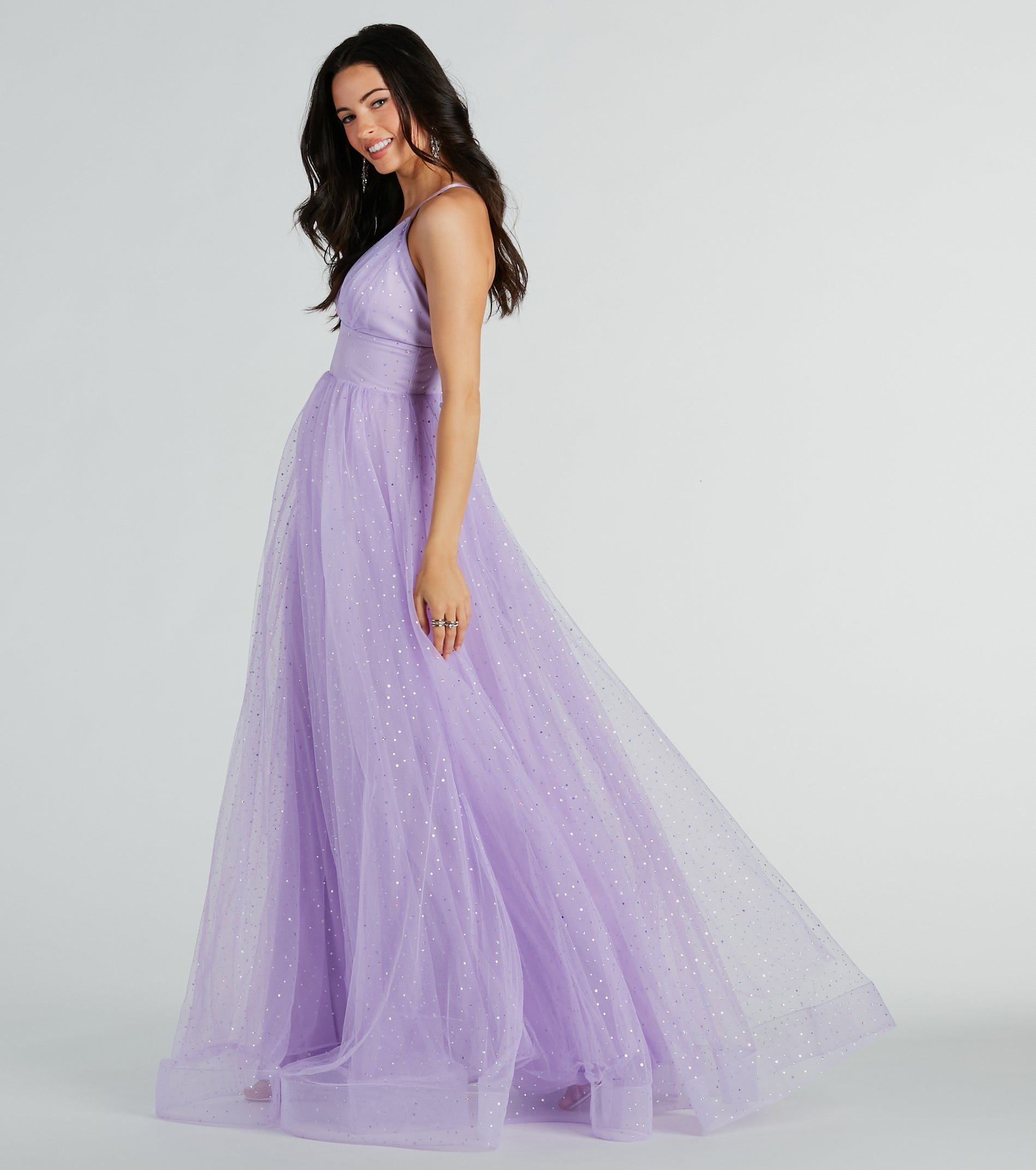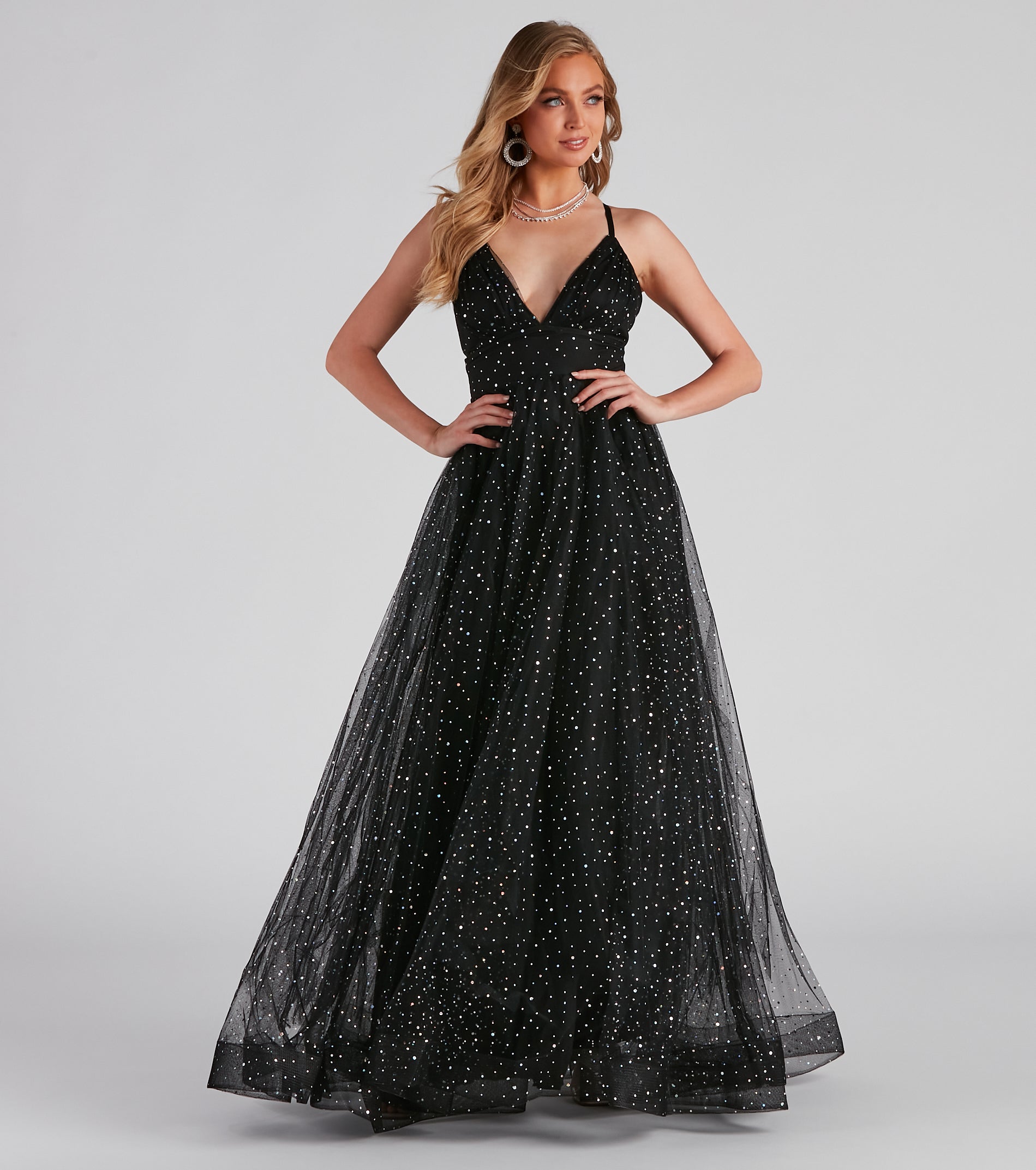 This prom season. you’ll for sure bring that dramatic flair with every step in our glam Vanessa tulle gown! She features a sleeveless plunging V-neckline with pleated detailing at the bust. adjustable spaghetti straps that lead to a cross-back design. a high waist seam. and a floor-length flowy ball gown silhouette. The dress is composed of layers of chic tulle with a knit lining and showcases all-over iridescent sequins for the prettiest sparkle. Style this dress with the perfect pair of .