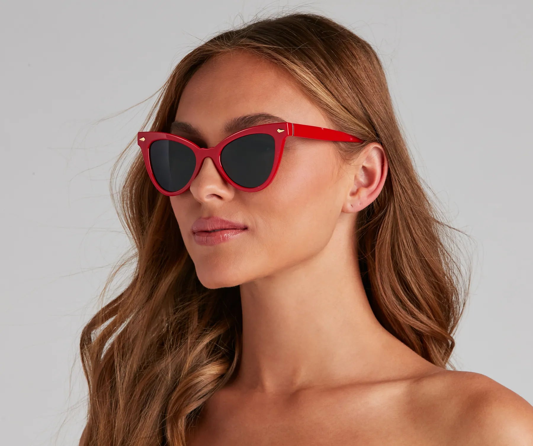Create a head-to-toe vintage-inspired look starting with these cat-eye sunglasses! They feature a plastic frame. sturdy arms. and a curved lens. Complete the look in a trendy