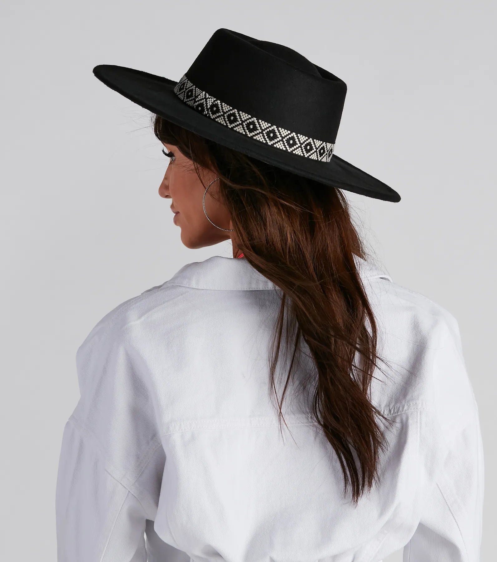 Kick your style up a notch in this western-inspired boater hat. It features a unique geo trim. a wide brim. and faux wool material. Complete the look in a crop top and boyfriend jeans.?