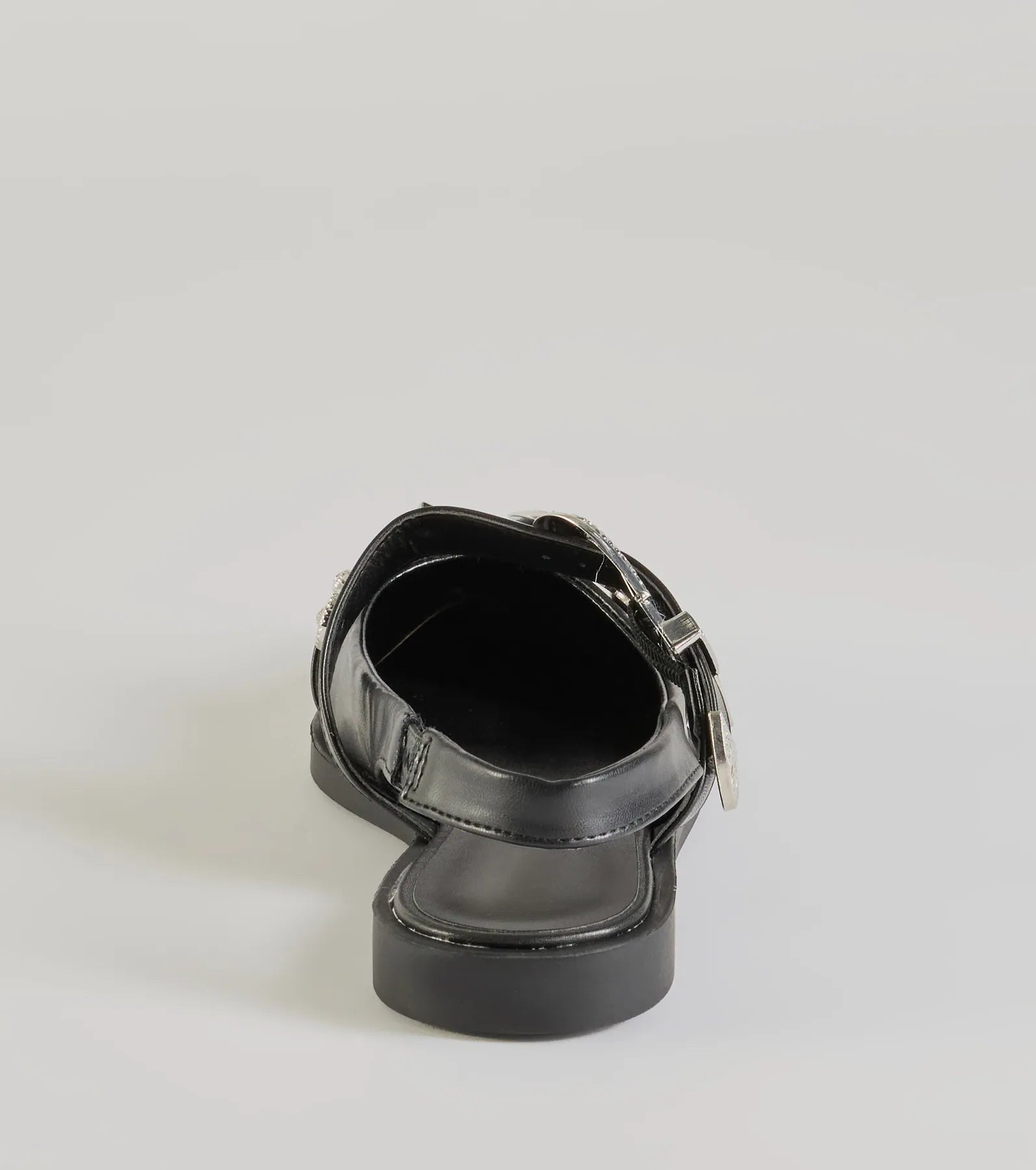 Bring that western flair to your chic fall ‘fits with these sleek faux leather flats featuring a closed pointed toe. dual etched buckle straps with studded accents. and a sling-back strap. Style with hoop earrings.