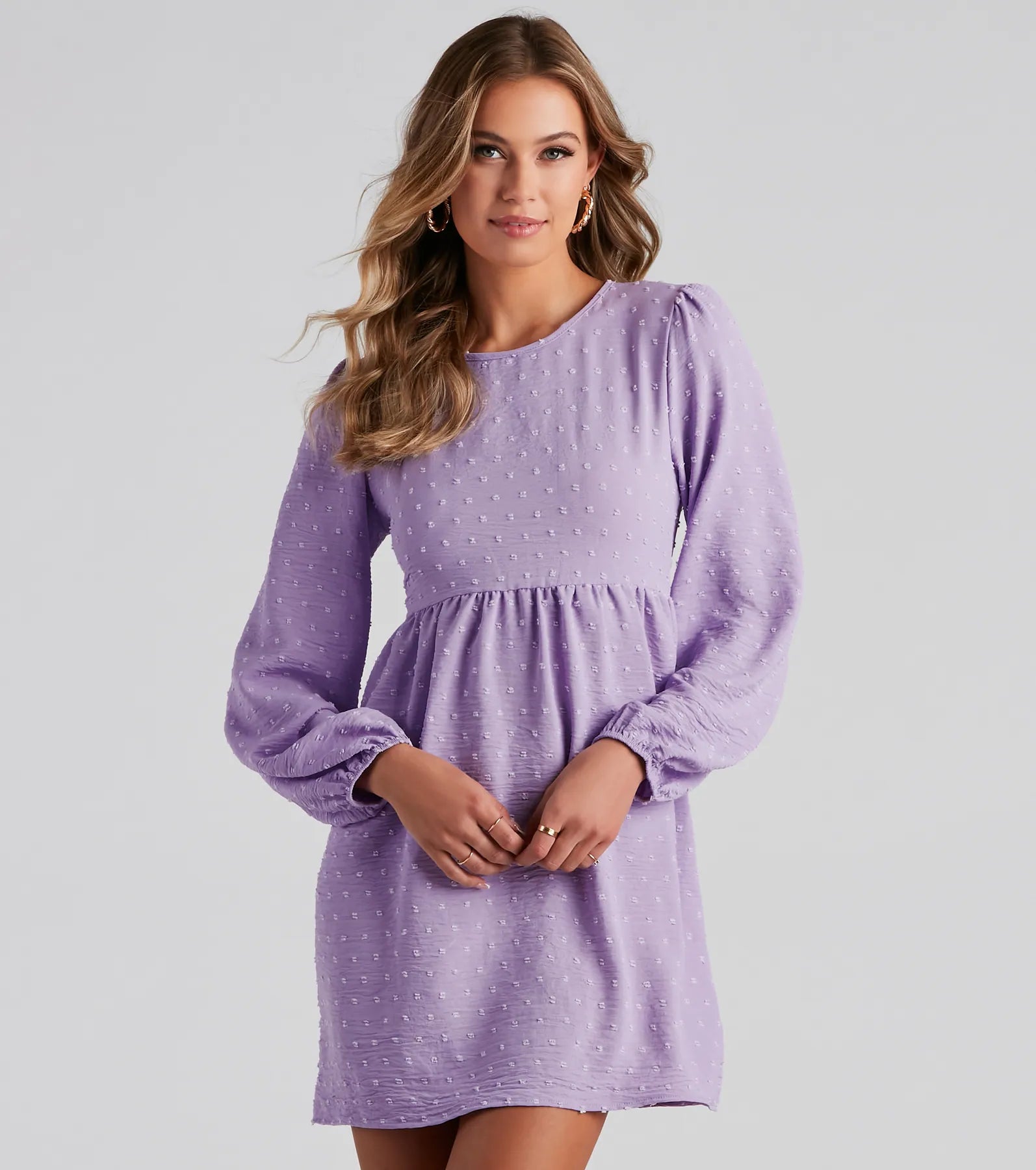 A little bit whimsy with a whole lot of charm! This swiss dot skater dress was made for a day out. It features long peasant sleeves. a crew neck. a back keyhole with button closure. and a flared short skirt. Complete the look in cute