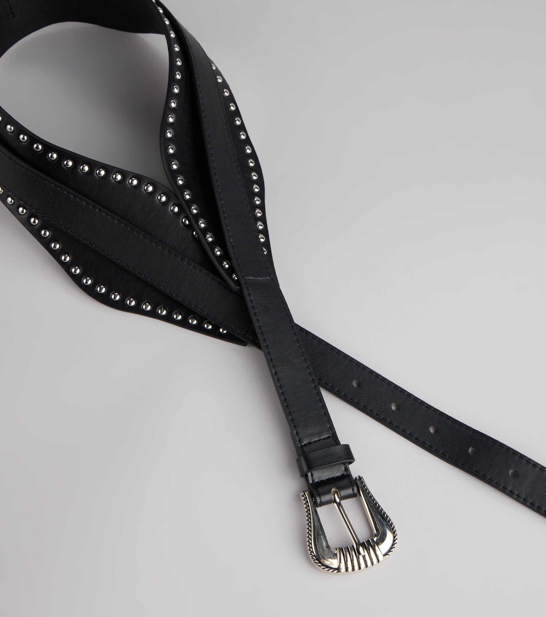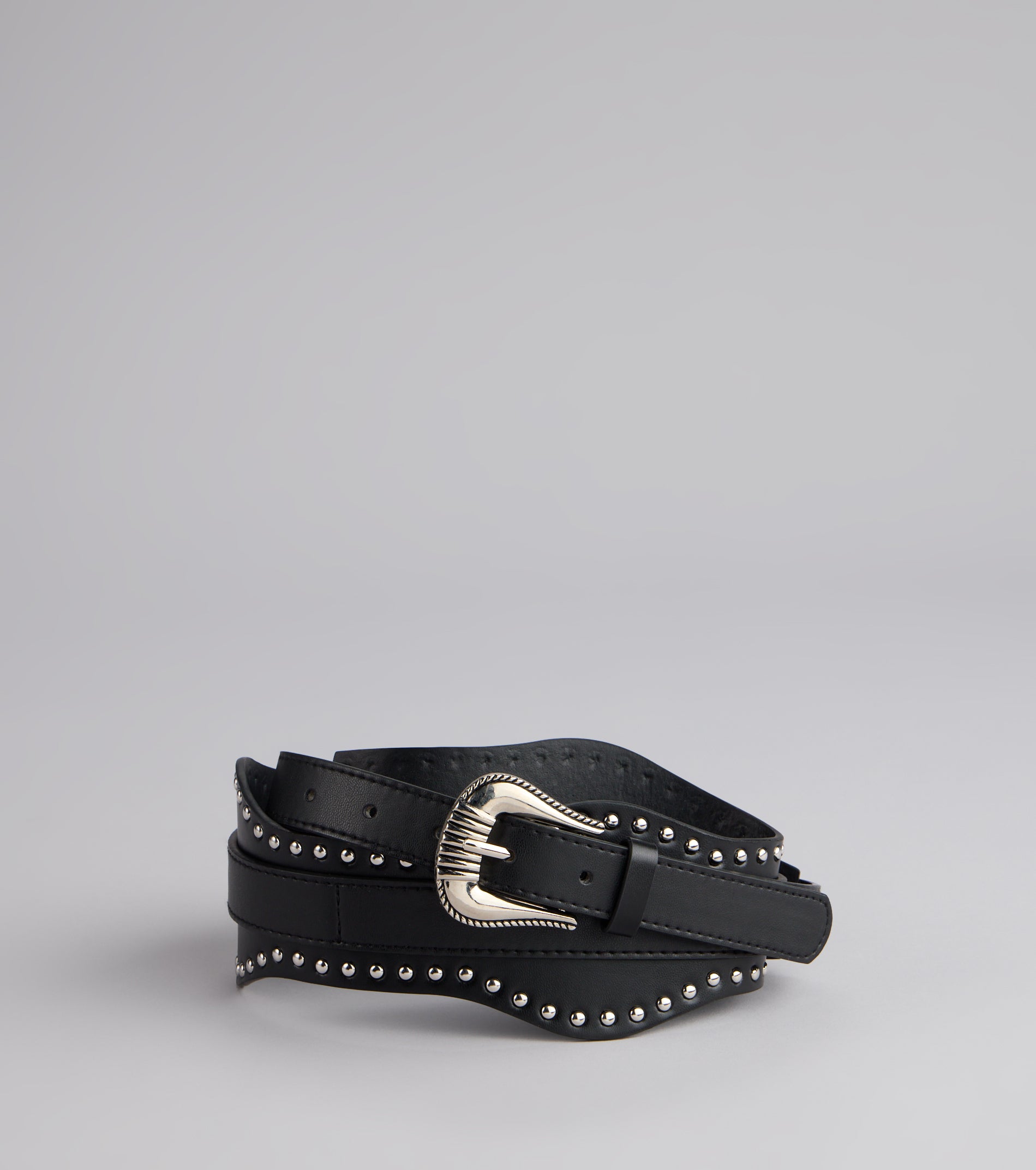Add a little Western flair to your ‘fit with this scallop-studded faux leather belt. The bold buckle and edgy details make it the ultimate finishing touch.