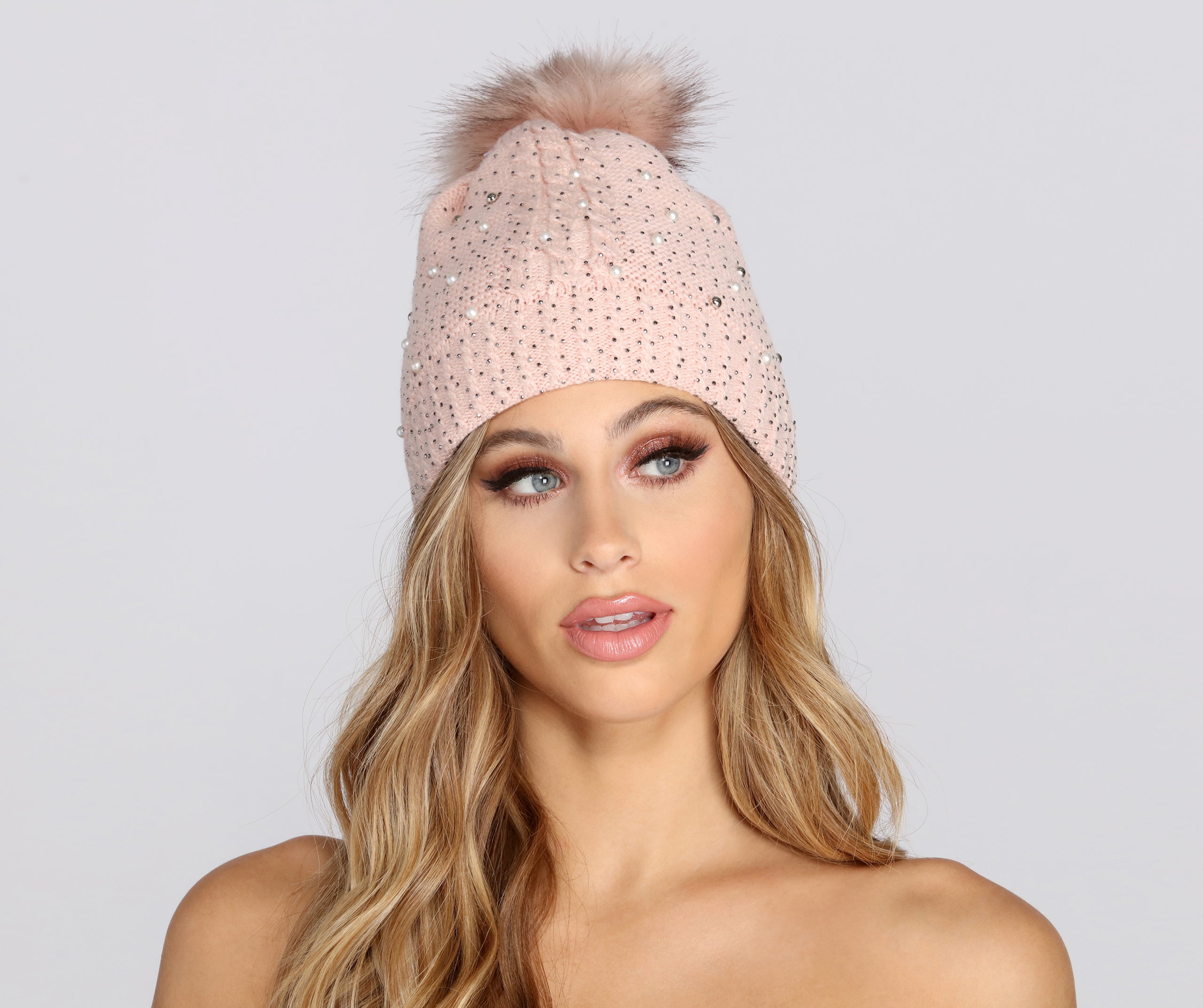 Add a touch of sparkle to your look! This beanie is designed with a ribbed knit head hugging structure. and is beaded with sparkling heat stones. sleek silver beads. and pearls! Topped with a faux fur pom pom. and composed of a stretchy ribbed knit material.