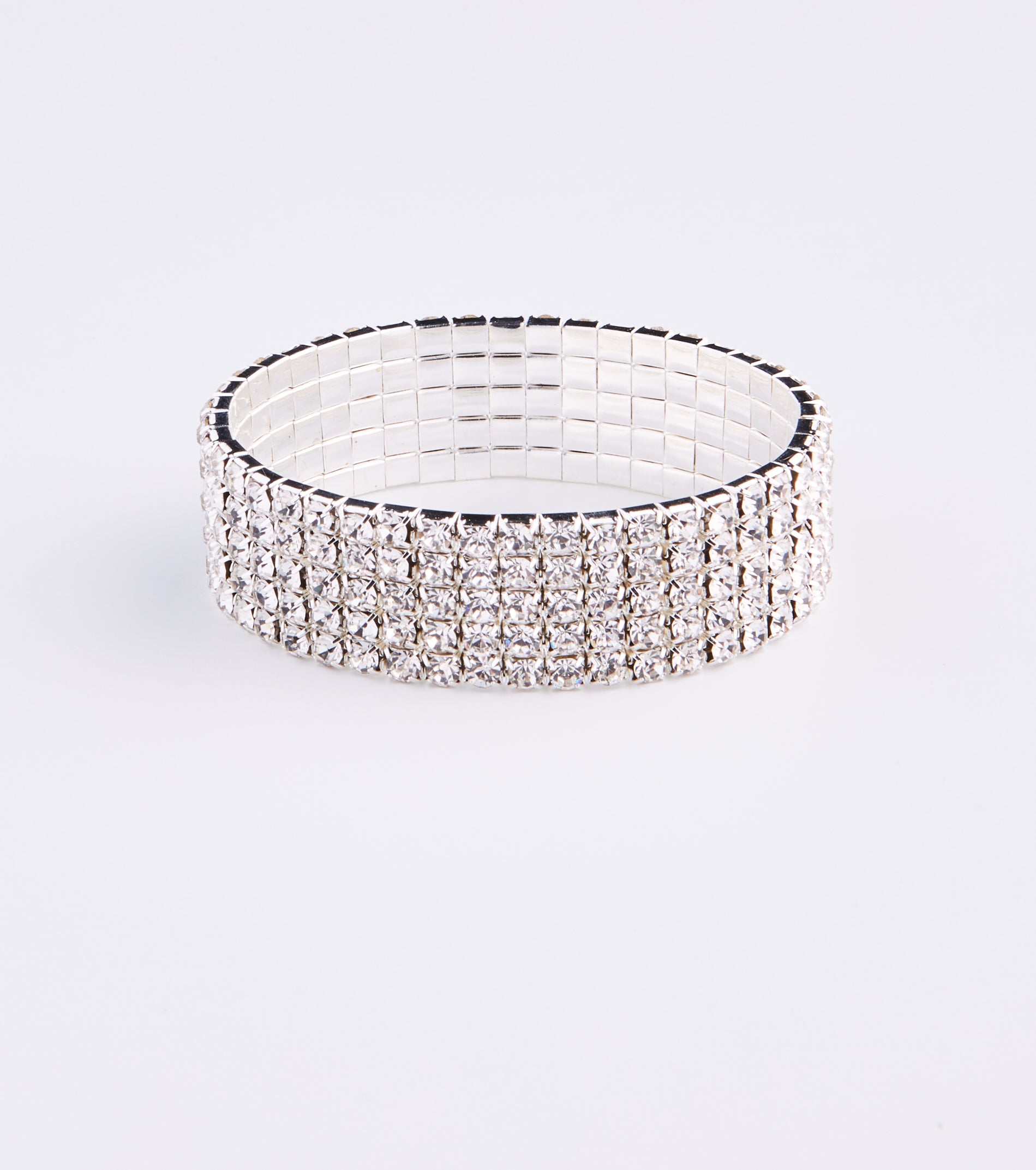 Dazzle up your outfit with this sparkly rhinestone stretch bracelet! Featuring rows of shimmering rhinestones to glam up your look. this bracelet is perfect for adding to your . Pair with a and strappy heels.