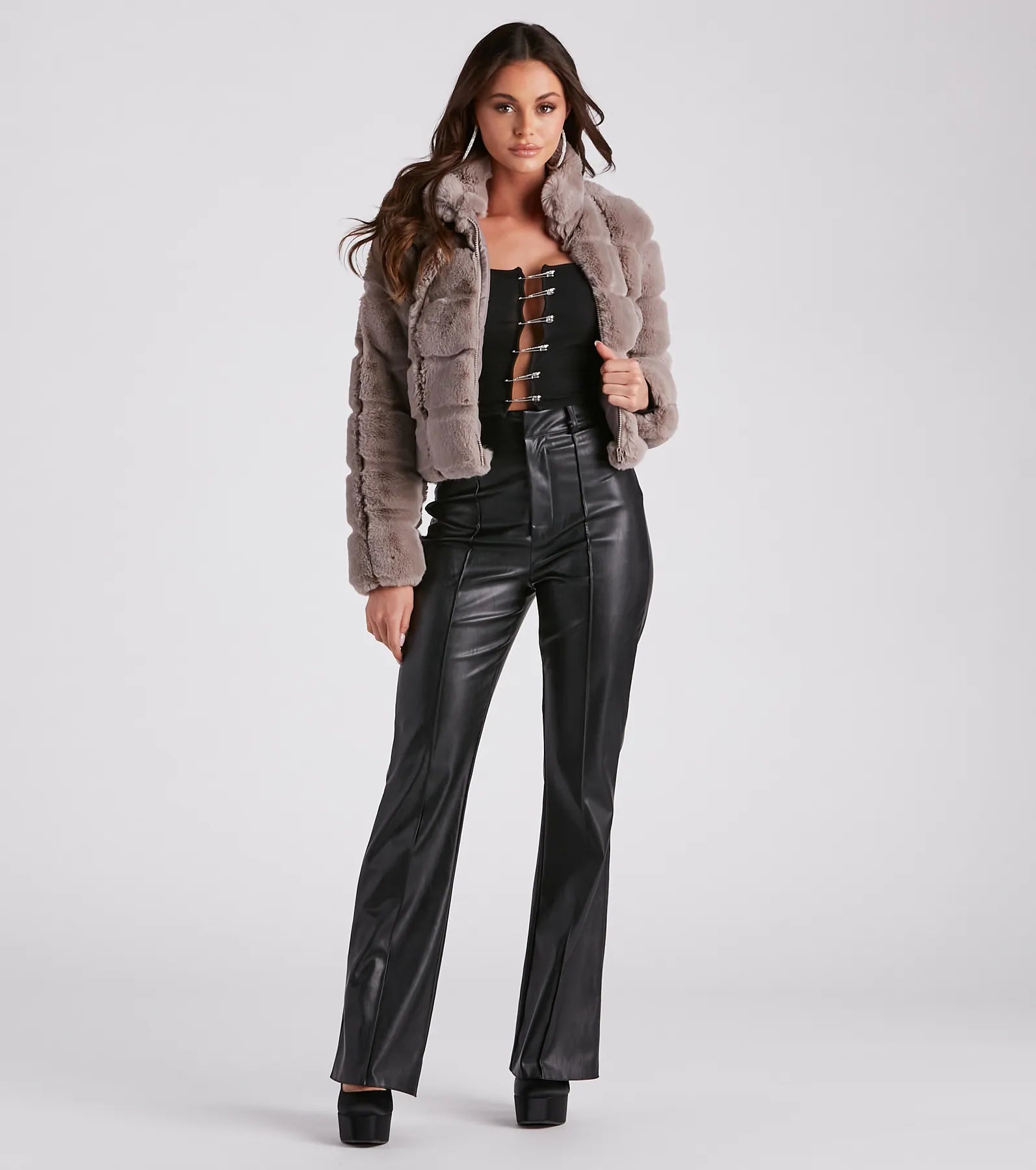 A girl’s gotta shine and this crop top brings the sparkle! It features fitted long sleeves. a scoop neckline. a front cutout with rhinestone embellished safety pins. and a fitted hem on stretchy rib-knit fabric. Style with to complete the look!?