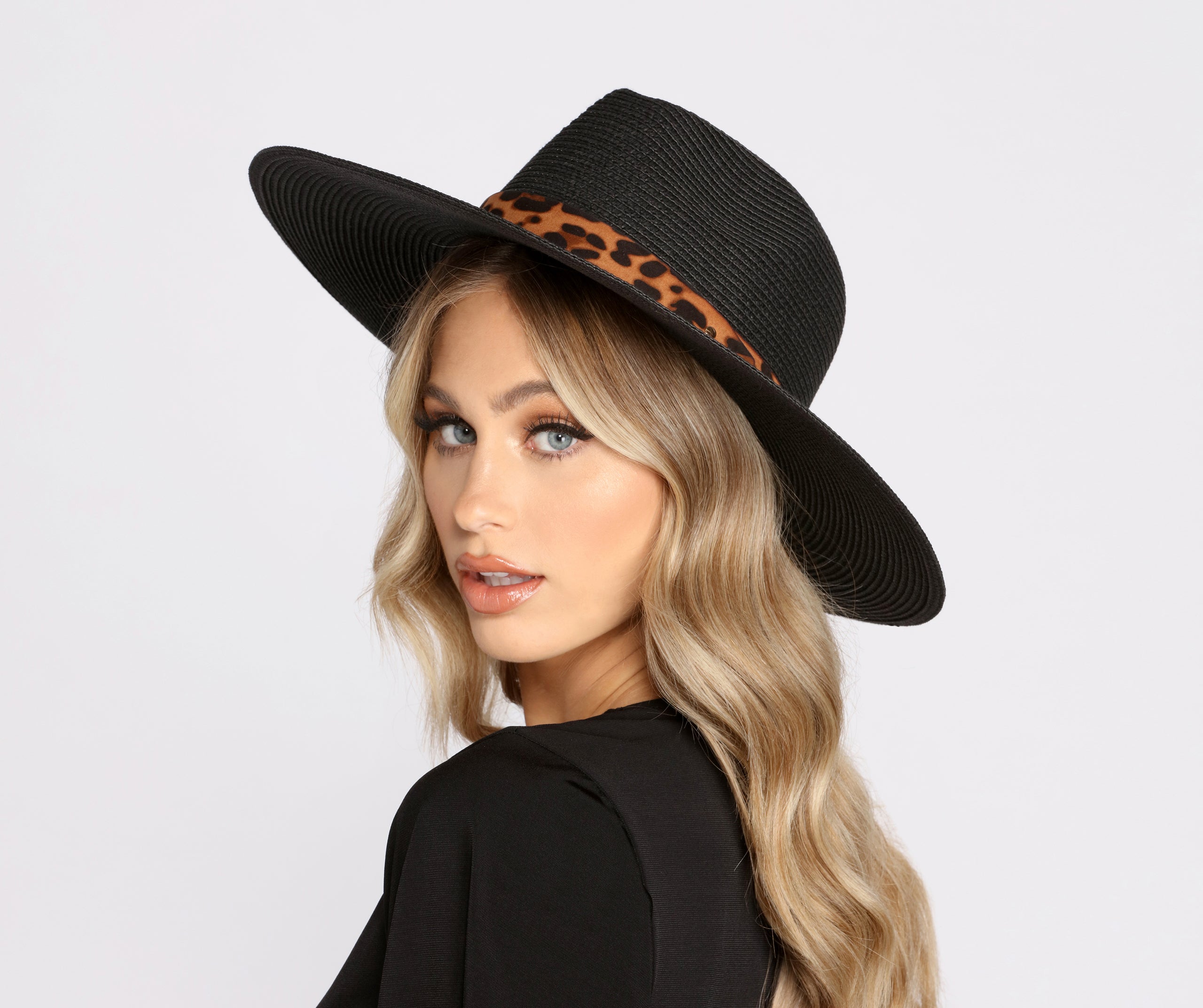 Bring a fun element to your summer look with a touch of leopard! Style this dark yet summer-y hat with a flowing bell sleeve romper. or a black summer mini dress!