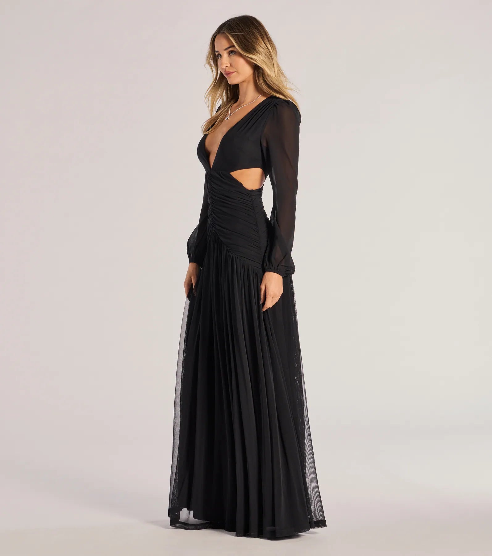 Showcase stylish sophistication in the Adley dress accented with chic details on mesh fabric that are sure to turn heads at your next formal affair. It features a plunging V-neckline for an alluring look. sheer long balloon-style sleeves. asymmetric cutouts at the waist. a ruched drop waist design. and a floor-sweeping pleated A-line silhouette.