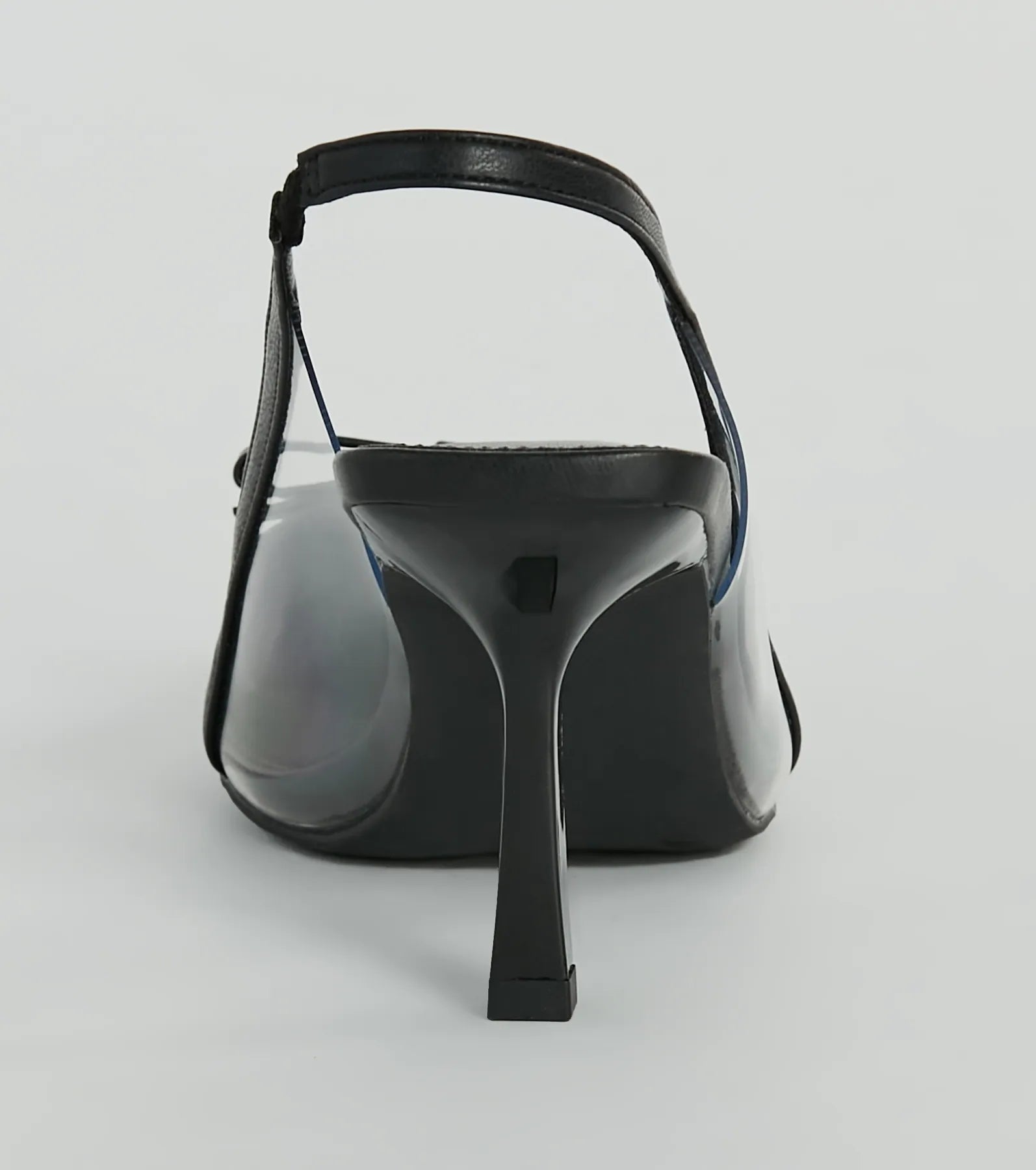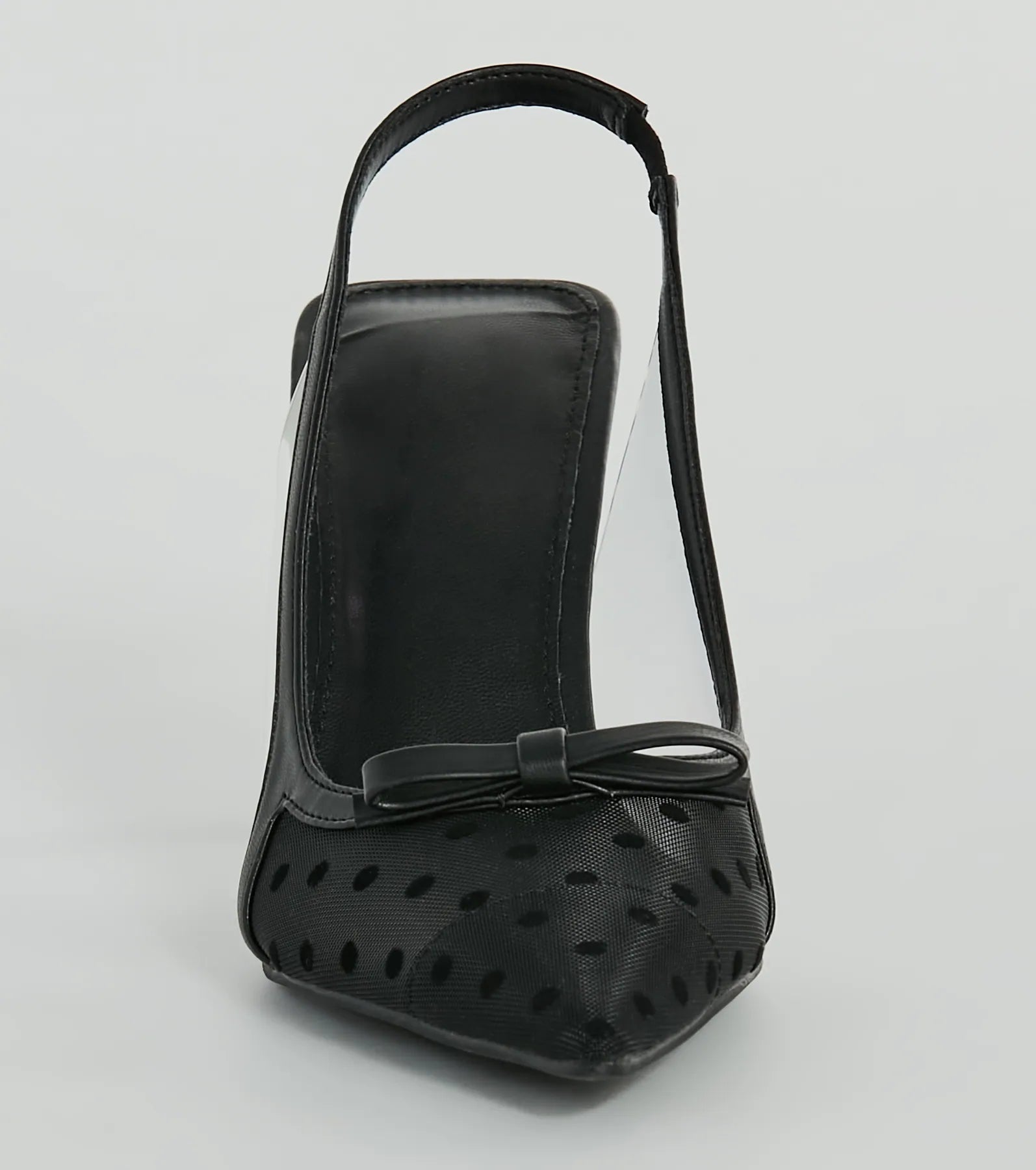 These adorably posh polka dot mesh slingback pumps are chic perfection! They feature a stiletto heel. a pointed-toe designed with a sheer mesh material with a chic polka dot pattern. the cutest mini bow accent. and a thin slingback strap for effortless on-and-off styling. Pair these pumps with a and pearl earrings!