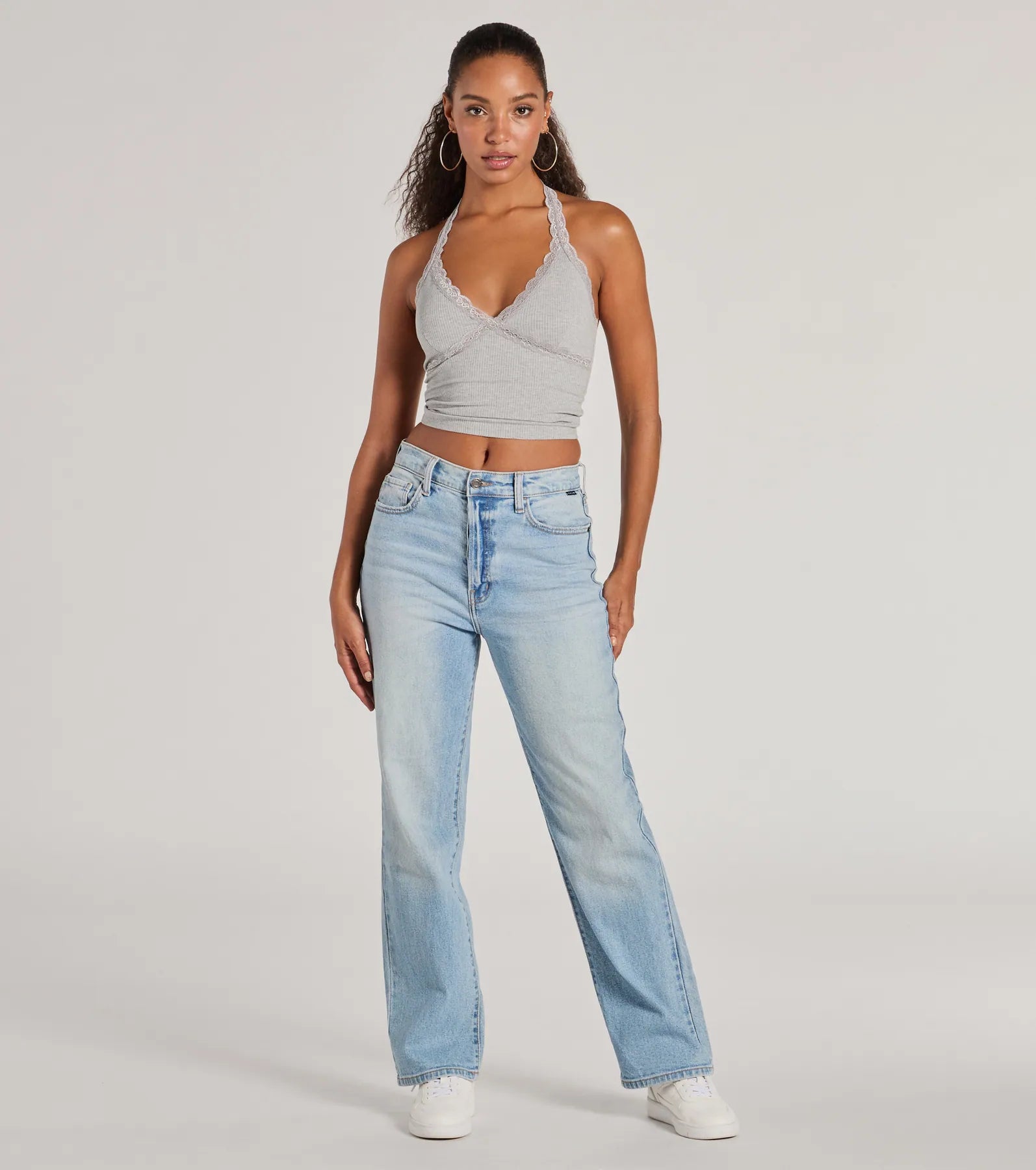 This adorable sleeveless top features a halter V-neckline with a dainty lace trim and a fitted mid-length hem. The ribbed knit fabric offers plenty of stretch for comfortable wear. Perfect for everyday. pair with jeans and sneakers.