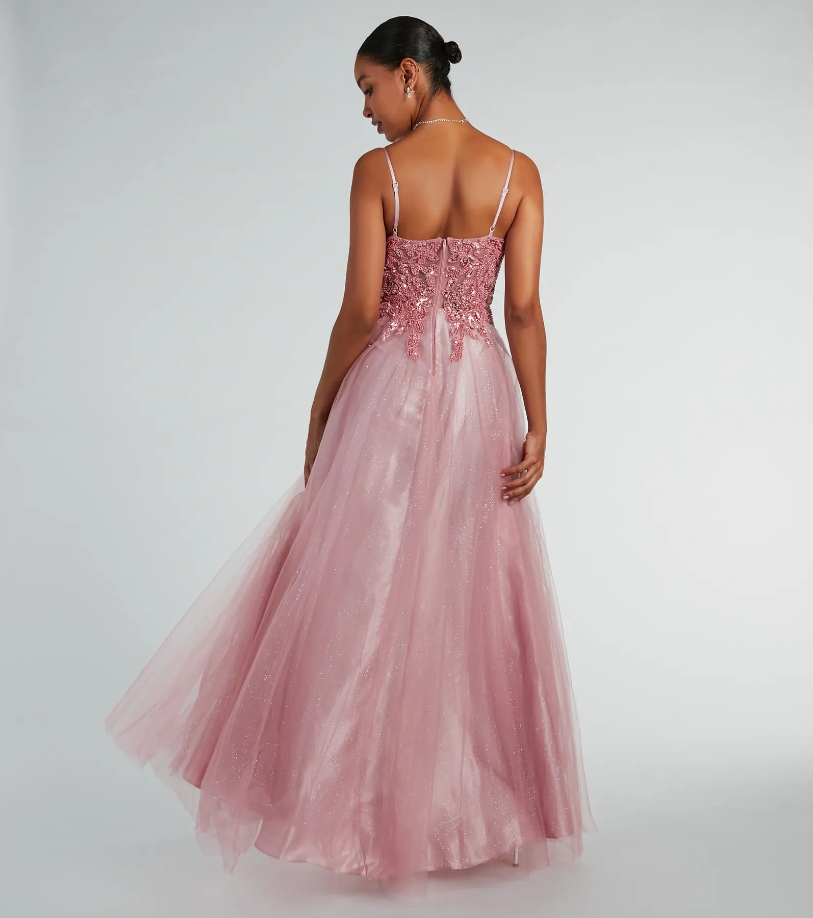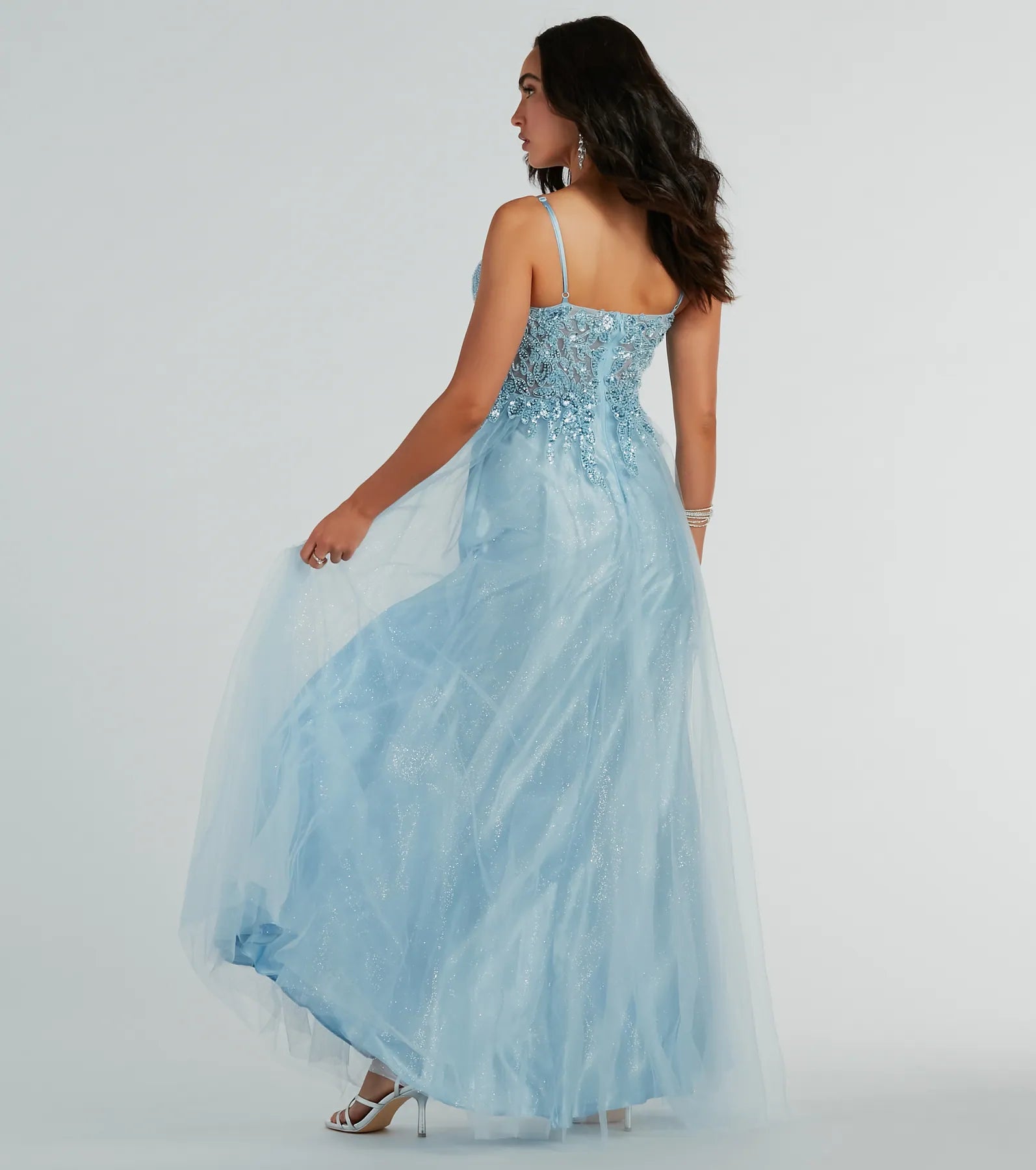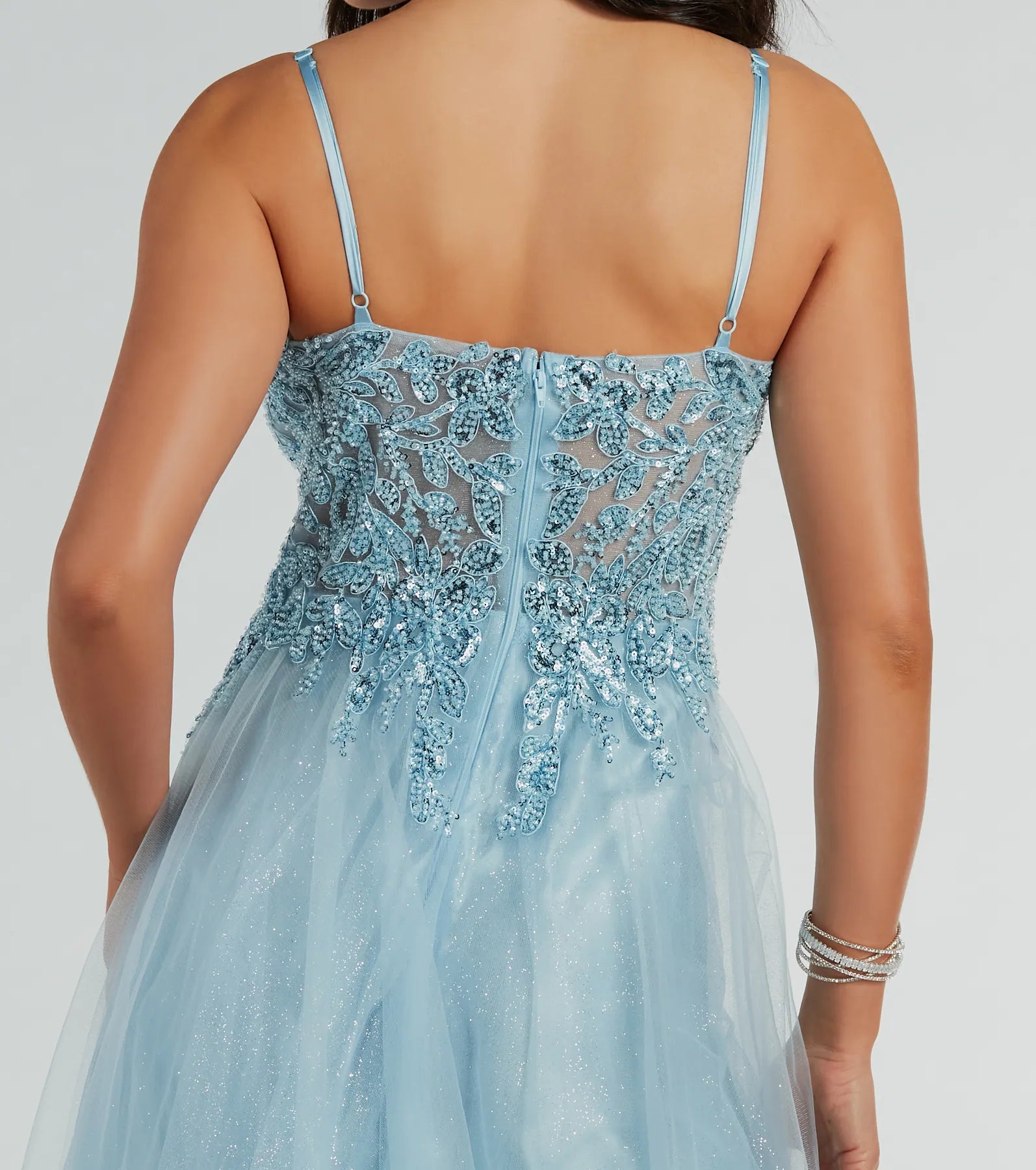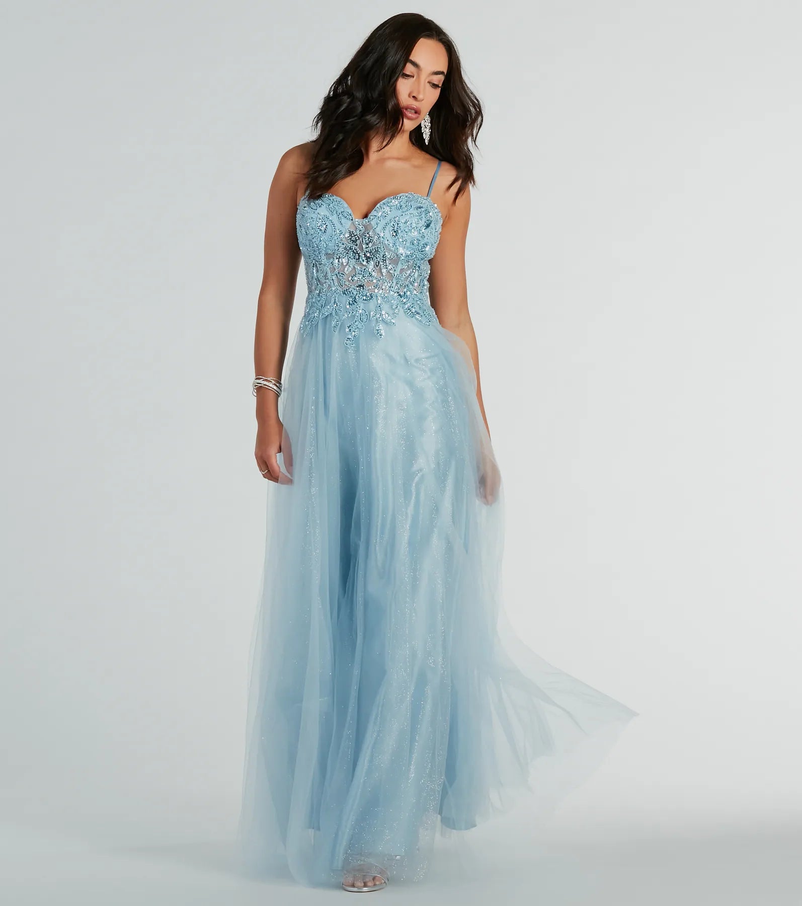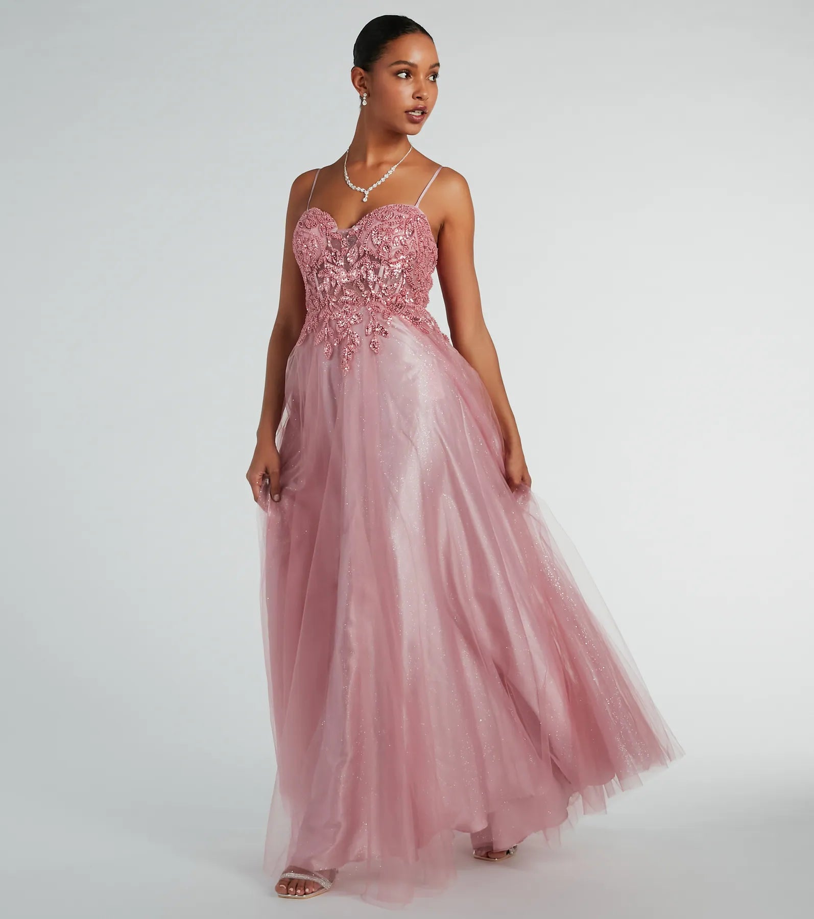 Step out of the pages of your favorite princess tale in the Aila A-line glitter formal dress for prom or as the gorgeous birthday girl! The sweetheart neckline. built-in underwire padded bust. and flexible boning offer support and structure while adjustable spaghetti straps ensure a perfect fit. The beaded applique along the bodice adds a touch of elegance to the A-line silhouette. and the glitter mesh fabric with satin woven lining creates a dazzling and glamorous look. Designed for the most exclusive occasions. this floor-length dress will make you feel like a dazzling princess! Complete the look with a stunning and earrings.