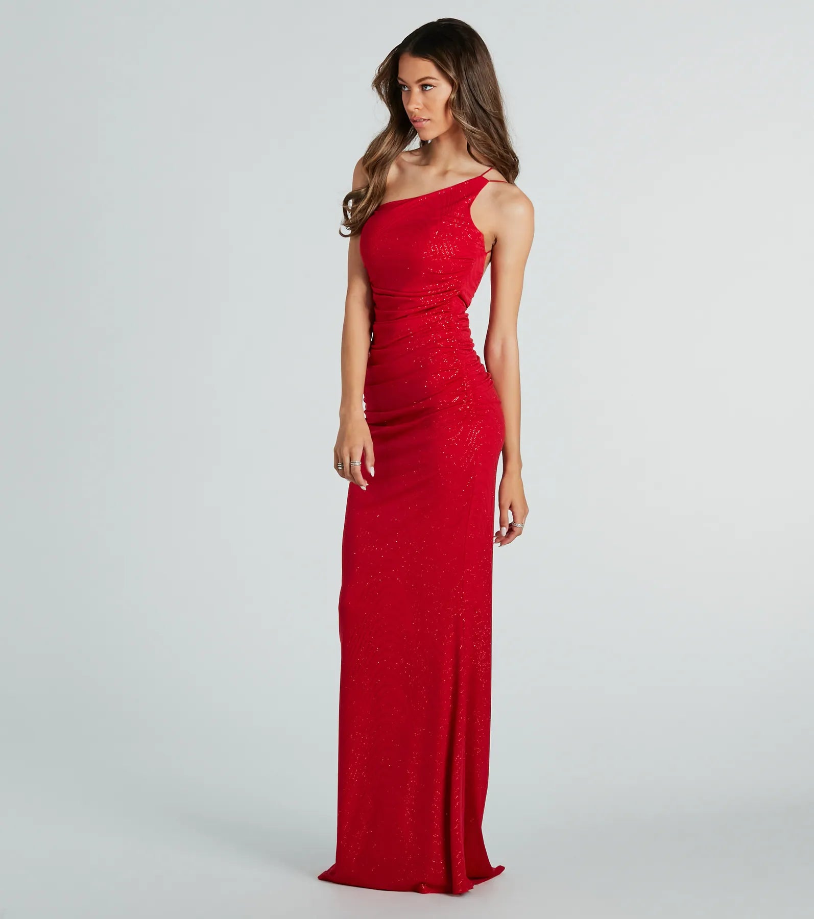 Bring the glitzy allure with the gorgeous glitter detailing of the Aileen formal mermaid dress! She features a sleeveless asymmetric one-shoulder neckline with a built-in padded bust. dual spaghetti straps that lead to a strappy back design. ruched detailing at the waist. a dramatic floor-sweeping hem with a figure-flaunting mermaid silhouette. and a glamorous glitter swirl pattern on the knit fabric. Complete your red-carpet-worthy look with for that luxe sparkle.