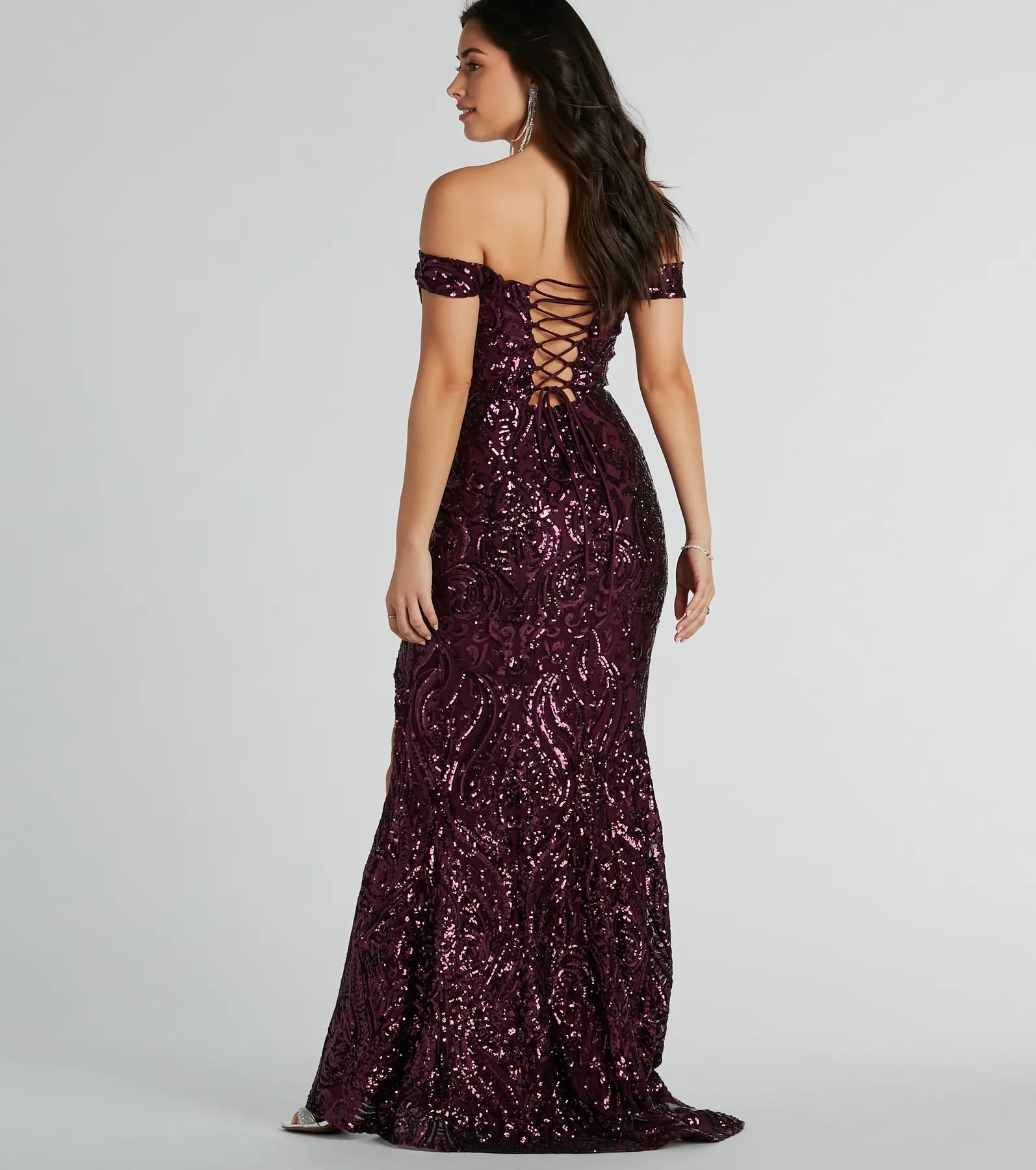 Exude luxury in the stunningly chic Alanna off-the-shoulder sequin mermaid dress at your next black-tie affair. The lined mesh fabric is accented with gorgeous shimmering sequin embroidery in an intricate scroll pattern for a stunning look. She is shaped with an off-the-shoulder sweetheart neckline. short-sleeved cuffs and padded bra cups for support. Her customizable lace-up strappy back design allows you to find your perfect find and adds a sultry allure. The curve-hugging mermaid silhouette is detailed with a high-cut front slit to showcase some leg along her bonded floor-length hem. Complete your formal look with and stiletto heels.