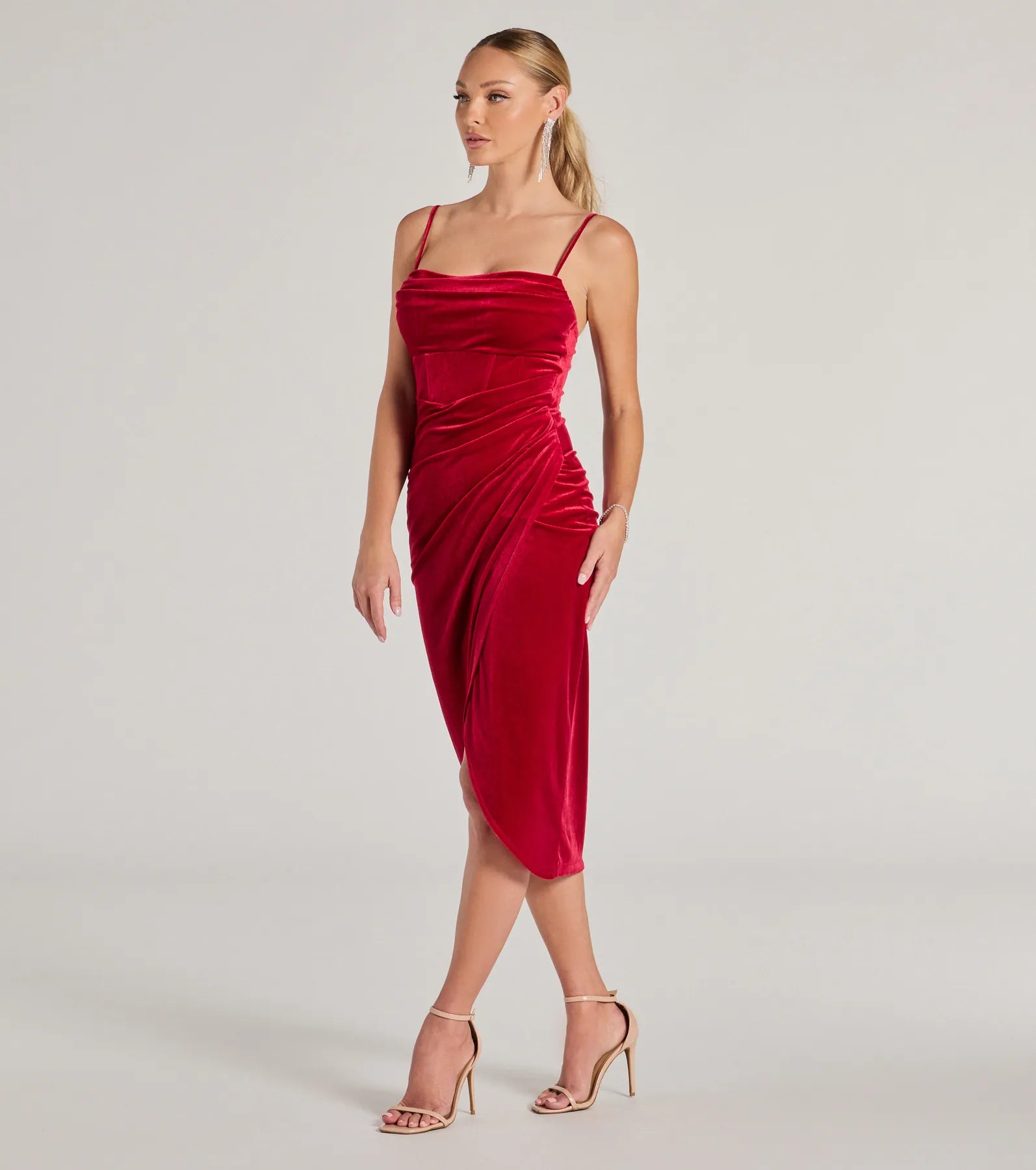 A velvet midi formal dress features a sultry cowl neckline and corset bodice that leads to the flattering bodycon silhouette with a front wrap slit. Perfect for homecoming or banquets.