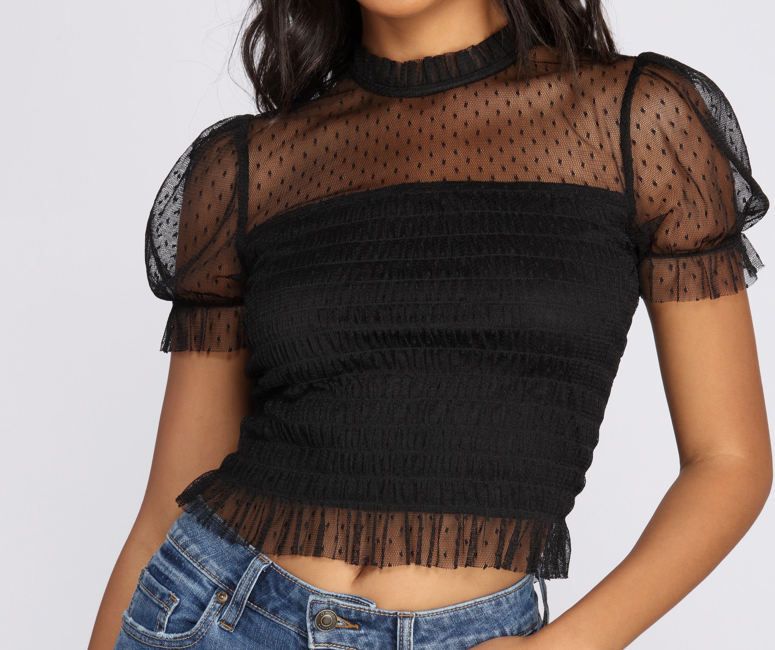 Get all classed up with this pretty little piece! It has a mock neck paired with short. balloon sleeves and a slim. smocked bodice. The garment is composed of a sheer mesh that features a small polka dot pattern that includes a keyhole back. and partial lining. Blouse offers a form hugging fit with minimal stretch.