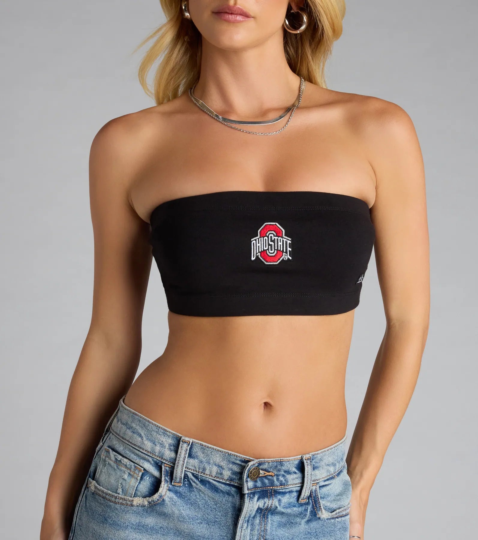 Certified cool-girl status—secured. This Ohio State® bandeau crop top brings stretchy comfort and big school spirit for game days. tailgates. or campus hangs.
