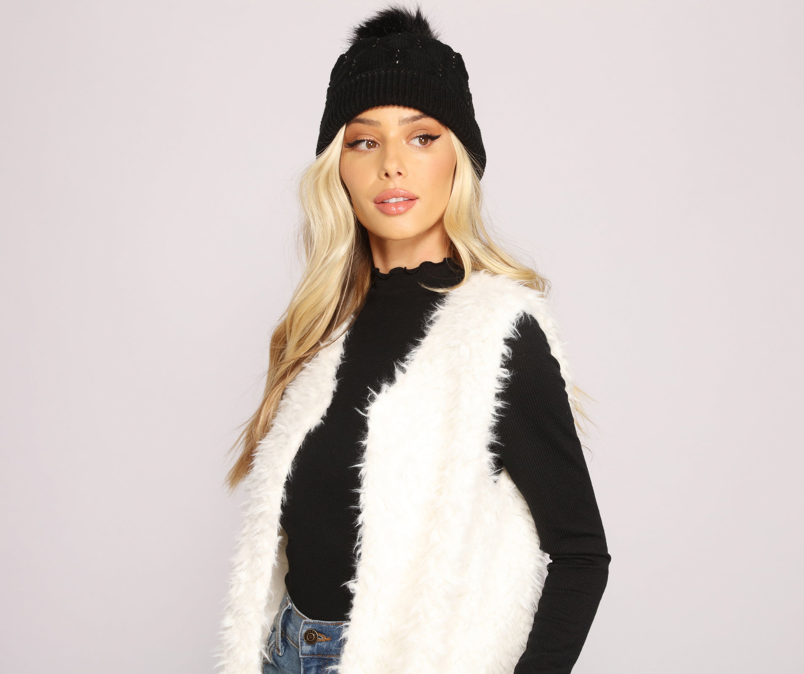 Bring the glitz and bling this winter in a beanie that slays! It features a chunky cable knit design. mini rhinestones throughout. and a faux fur pom pom accent. Pair this beanie with a and for a stylish warm-weather ‘fit.