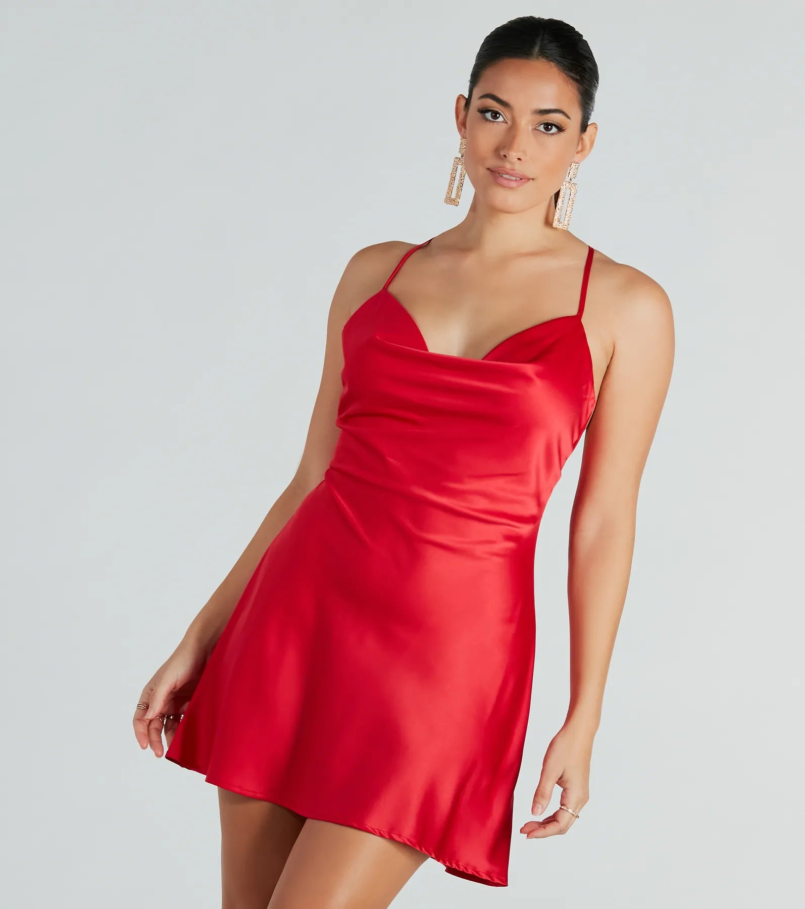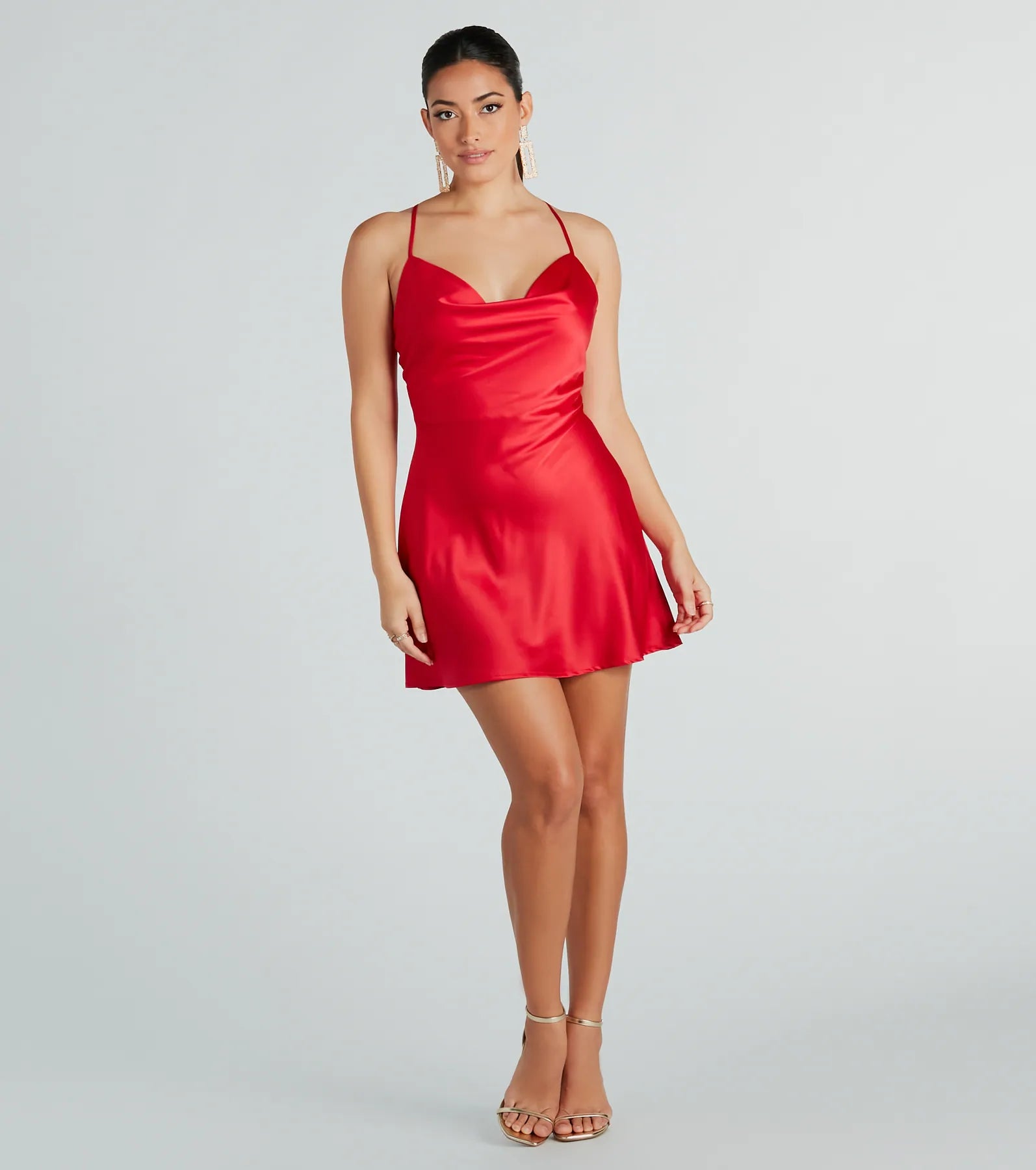 Oh-so-alluring and romantic will be your vibe in this sleek satin mini dress! Crafted from a silky lightweight satin fabric. this mini-length dress features a sleeveless cowl neckline. spaghetti straps. and an open back with a cross-back strappy design with a tie closure for an adjustable fit. and a flirty. flowy A-line silhouette. Style with and rhinestone heels for a dressy date night.