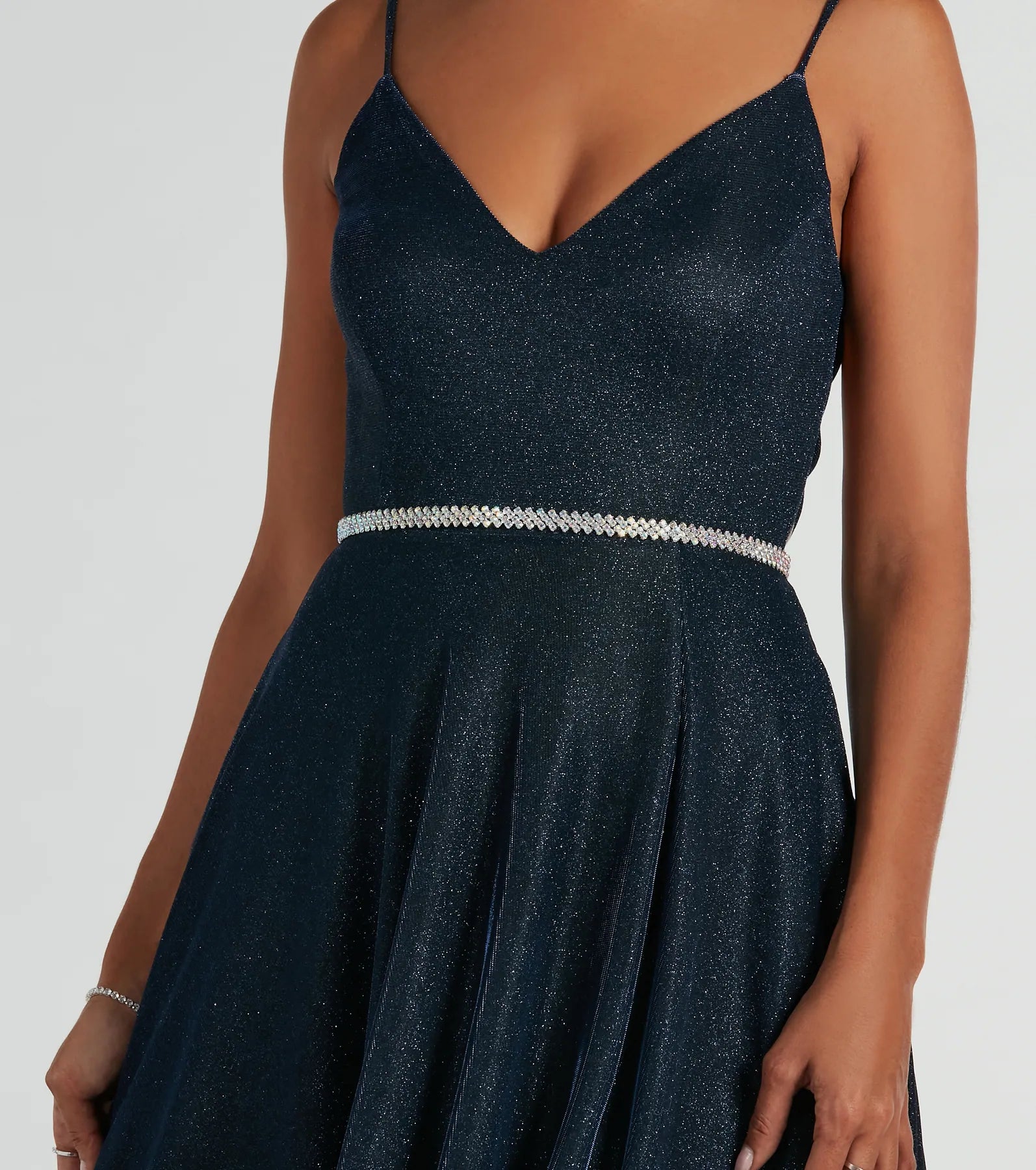 Always classy and chic! Finish your prom look in this rhinestone belt featuring a unique slanted two-row design with a back adjustable chain and lobster clasp closure. Perfect for styling with the matching sparkly bag and heels!