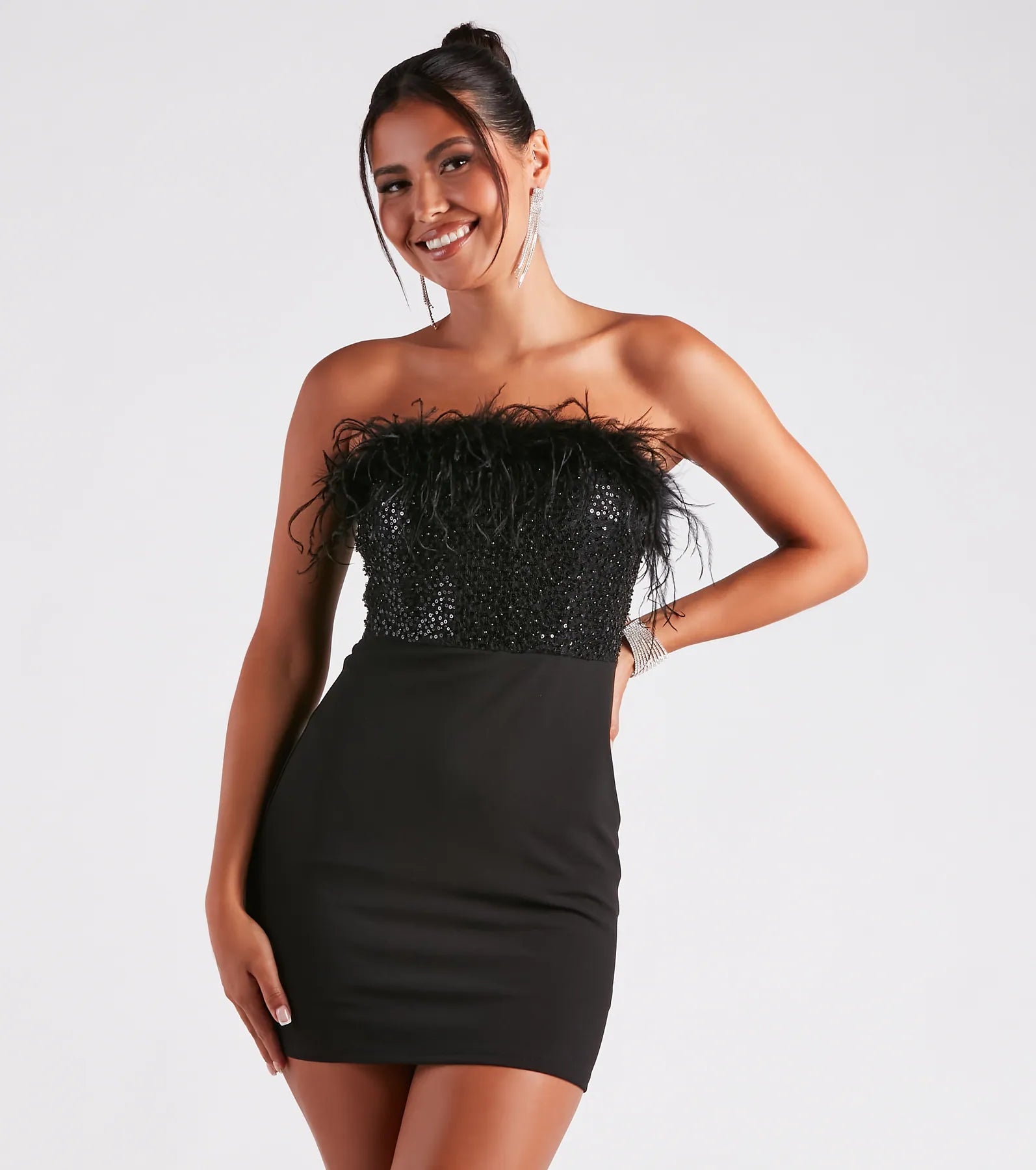 For dance queens or bachelorettes looking to make a memorable entrance. the Anabelle mini party dress will have all eyes on you! She features a strapless mesh corset bodice with feather trim. flexible boning. sequin and bead embroidery. and a flattering bodycon silhouette with a mini-length hem. The party dress is composed of partial-crepe fabric with a stretchy knit lining. Complete the look in this mini dress with .