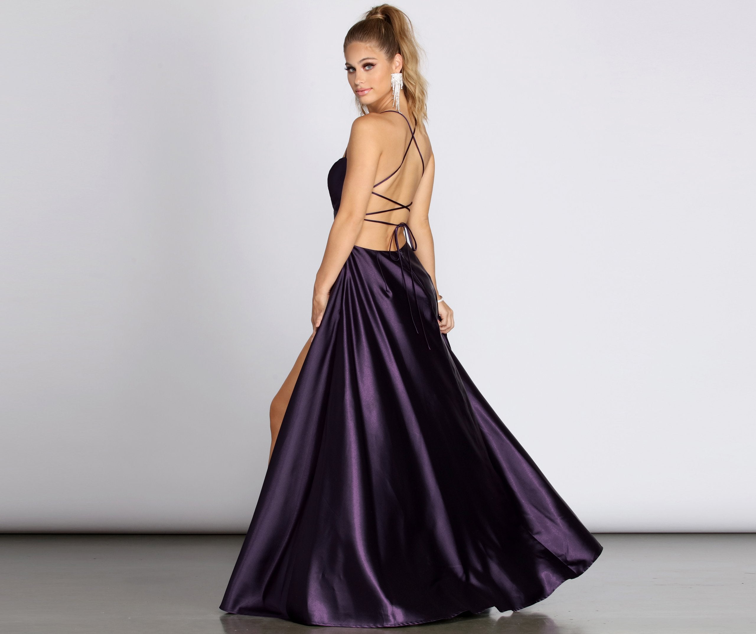 Stun in satin as you create a one-of-a-kind entrance in our Anne dress! She features a sleeveless bodice. a square neckline. padded cups. and spaghetti straps that lead to a lattice back design. Her empire waist leads to a floor-length skirt that is accented with pockets and a stunning waist-high slit. The dress is composed of a satin fabric that offers a relaxed fit with minimal stretch. Includes a back zipper closure. Complete look with a and heels.