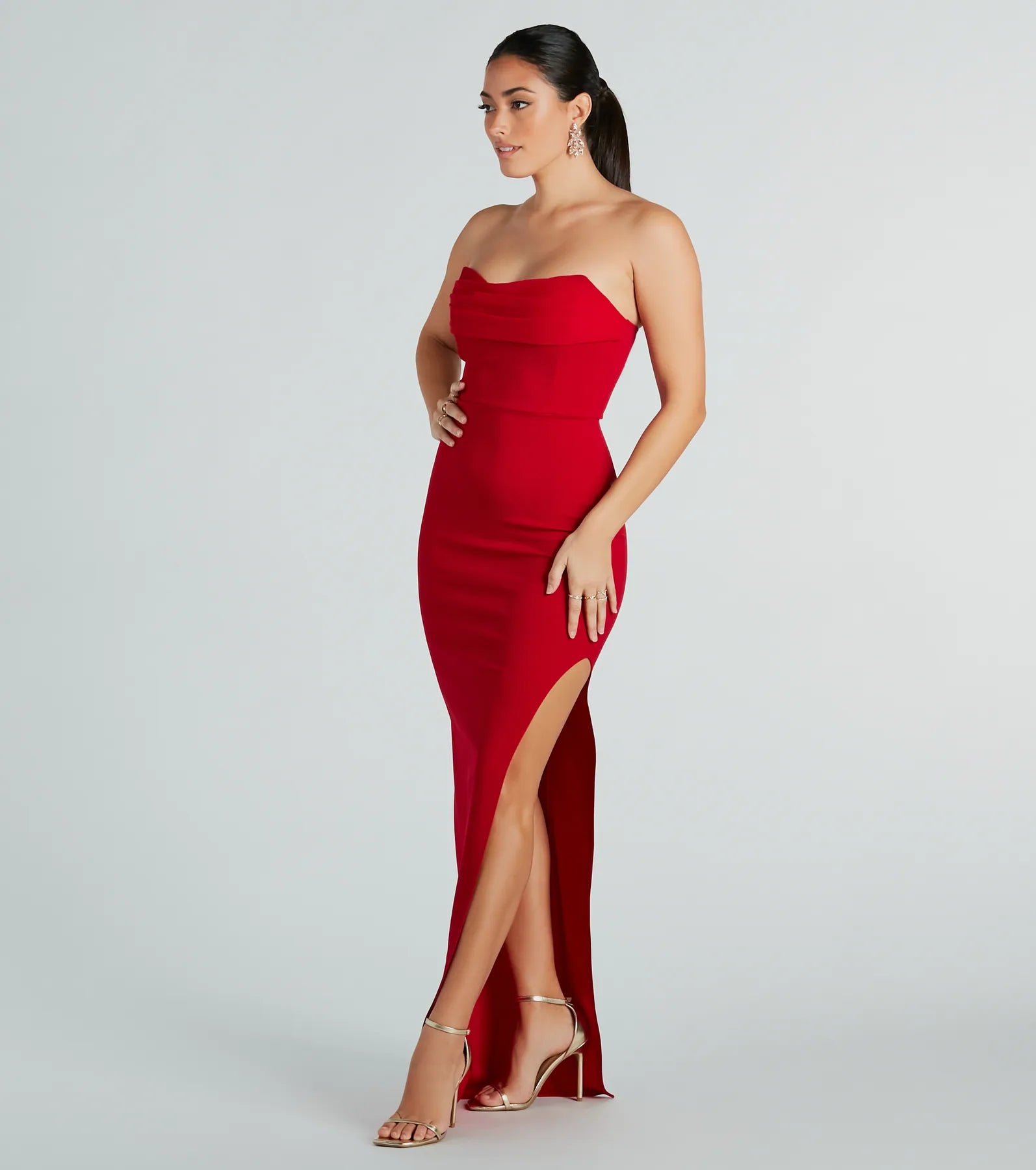 Got a flair for fabulous? Then the Aurie formal crepe long dress is the one you’re looking for! She features a strapless sweetheart neckline with a chiffon cowl overlay. flexible boning for structure. a flattering slim silhouette with a sexy high side slit to show some leg. and a long-length hem. The formal dress is crafted from a lightweight crepe fabric that fits like a glove and offers plenty of stretch. Complete the look with a for a black tie party!