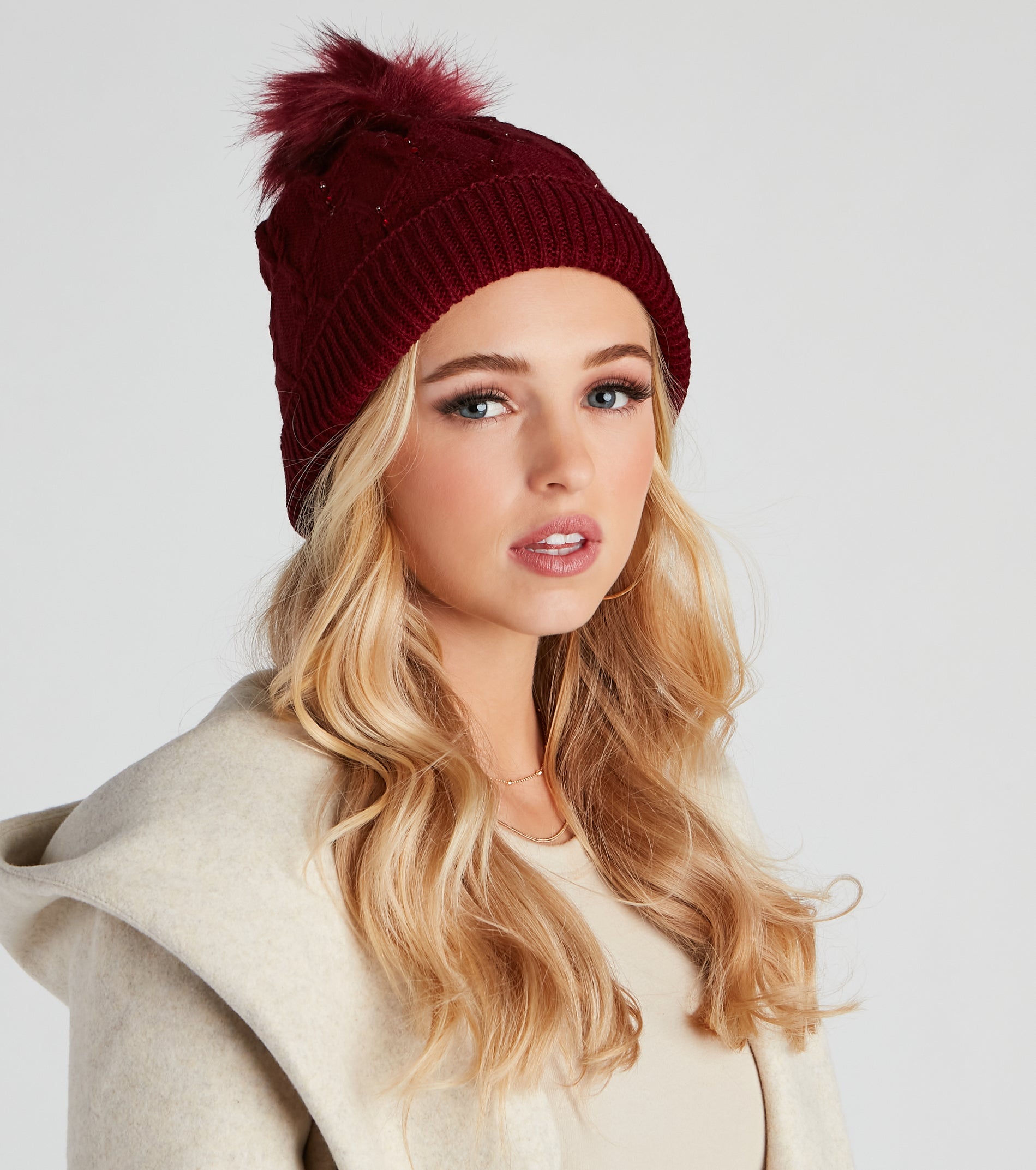 This autumn. sparkle. and shine accessorizing with this cable knit beanie featuring a faux fur pom. and rhinestone accents on soft and cozy fabric. Complete the look in a .