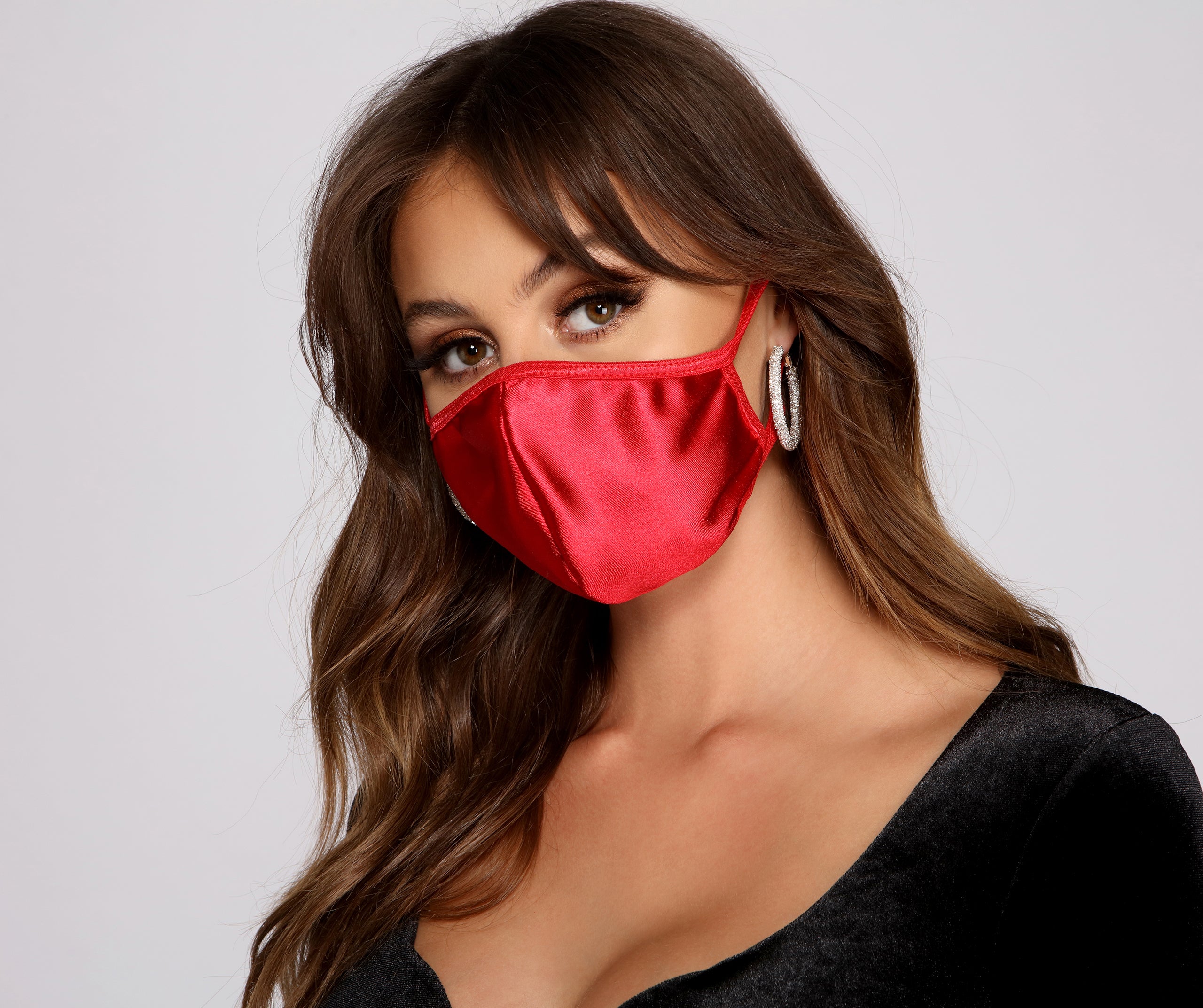 Show off your bad side in a face mask this Halloween! Perfect for styling with your devilishly wicked costume or create a mischievous cupid costume with this satin-like face mask. The face mask features a vibrant red hue. a breathable knit material with a satin-like exterior. and earloops for a customized fit.