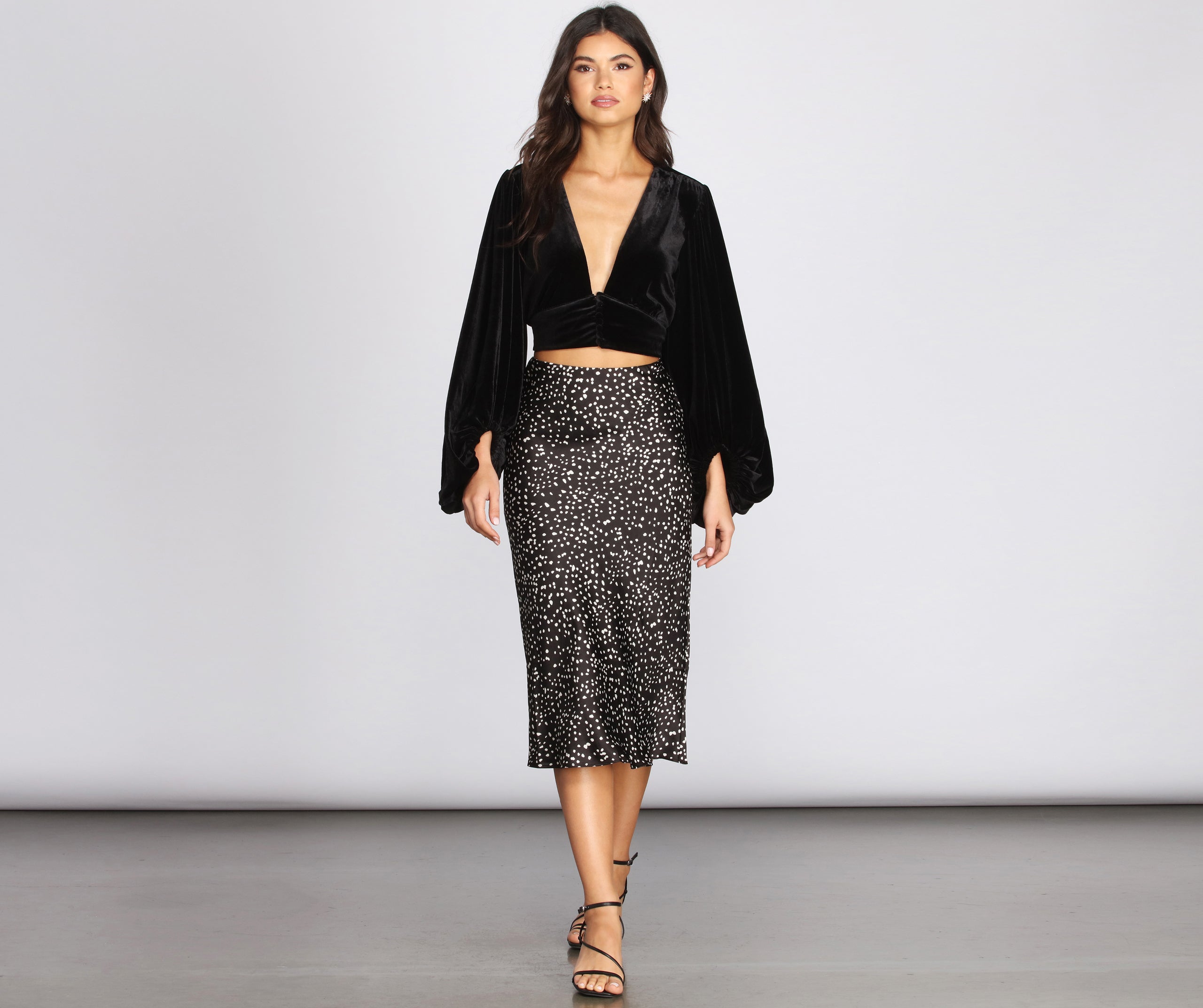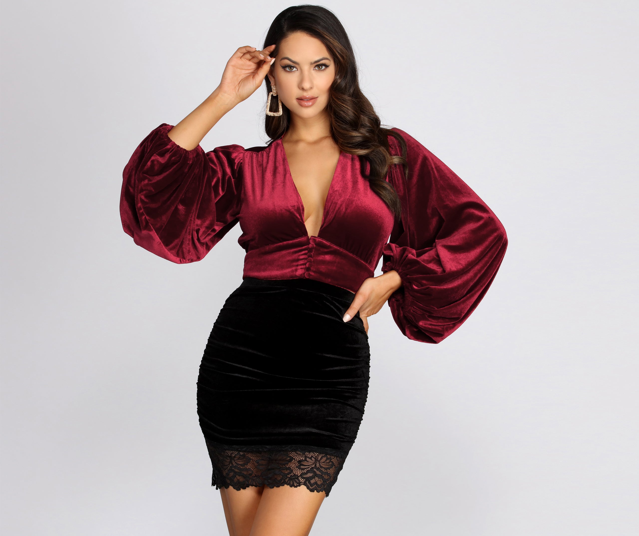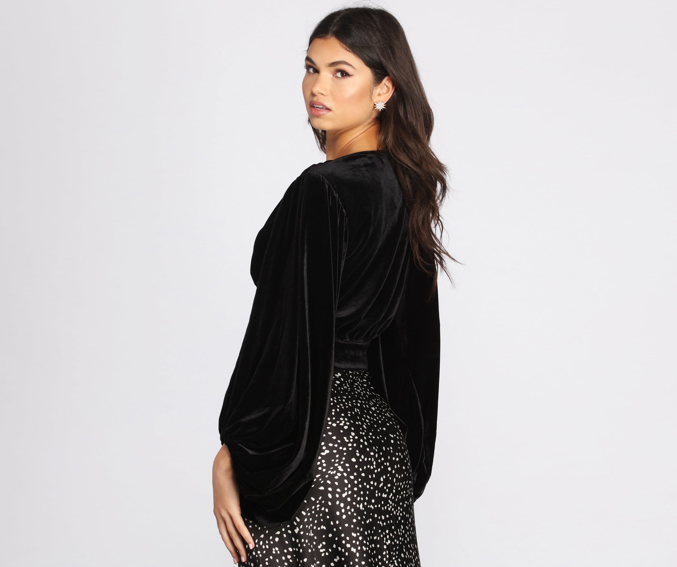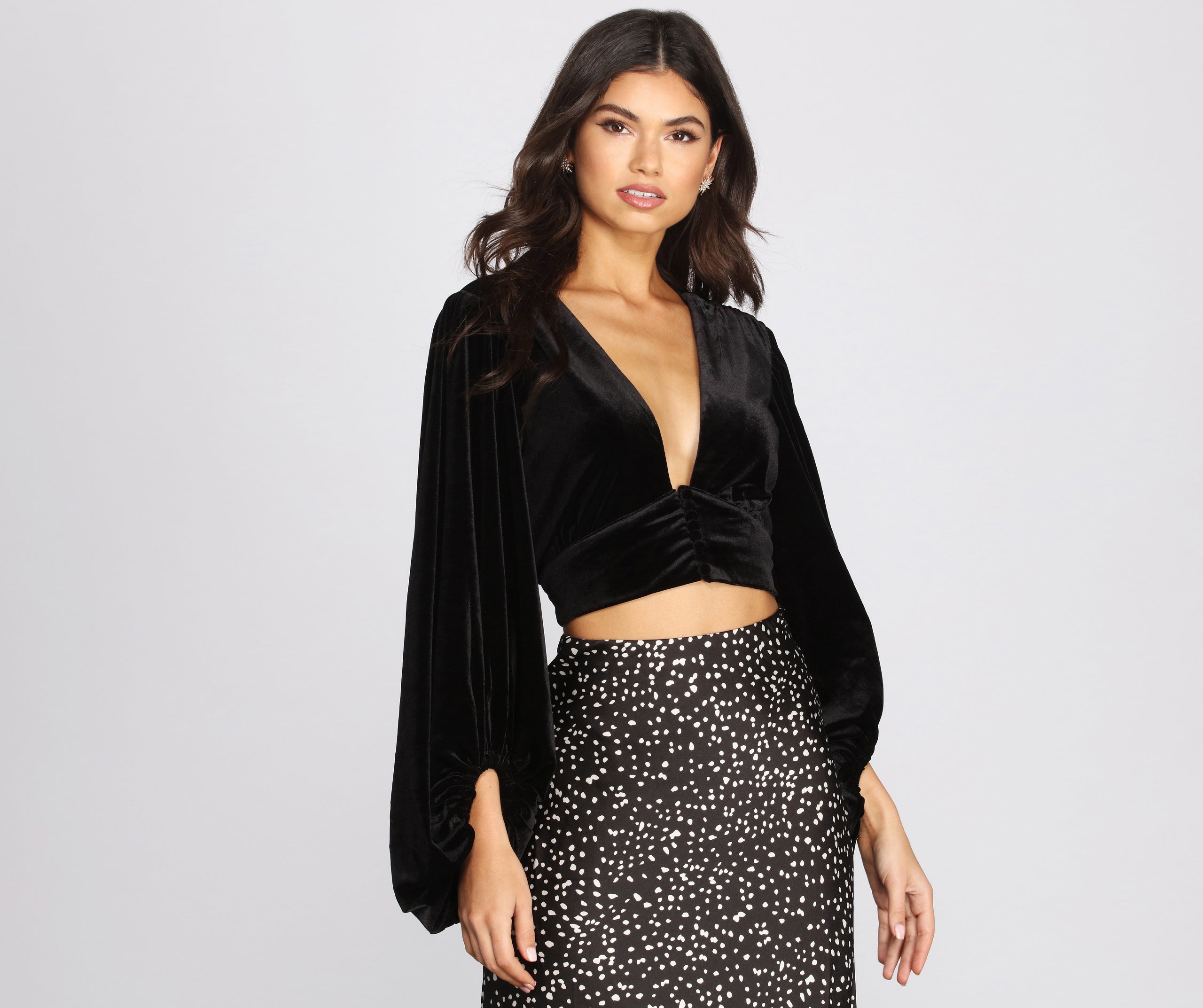 Balloon sleeves are totally on trend this season. and pair perfectly with velvet. This crop top is a must for holiday parties!