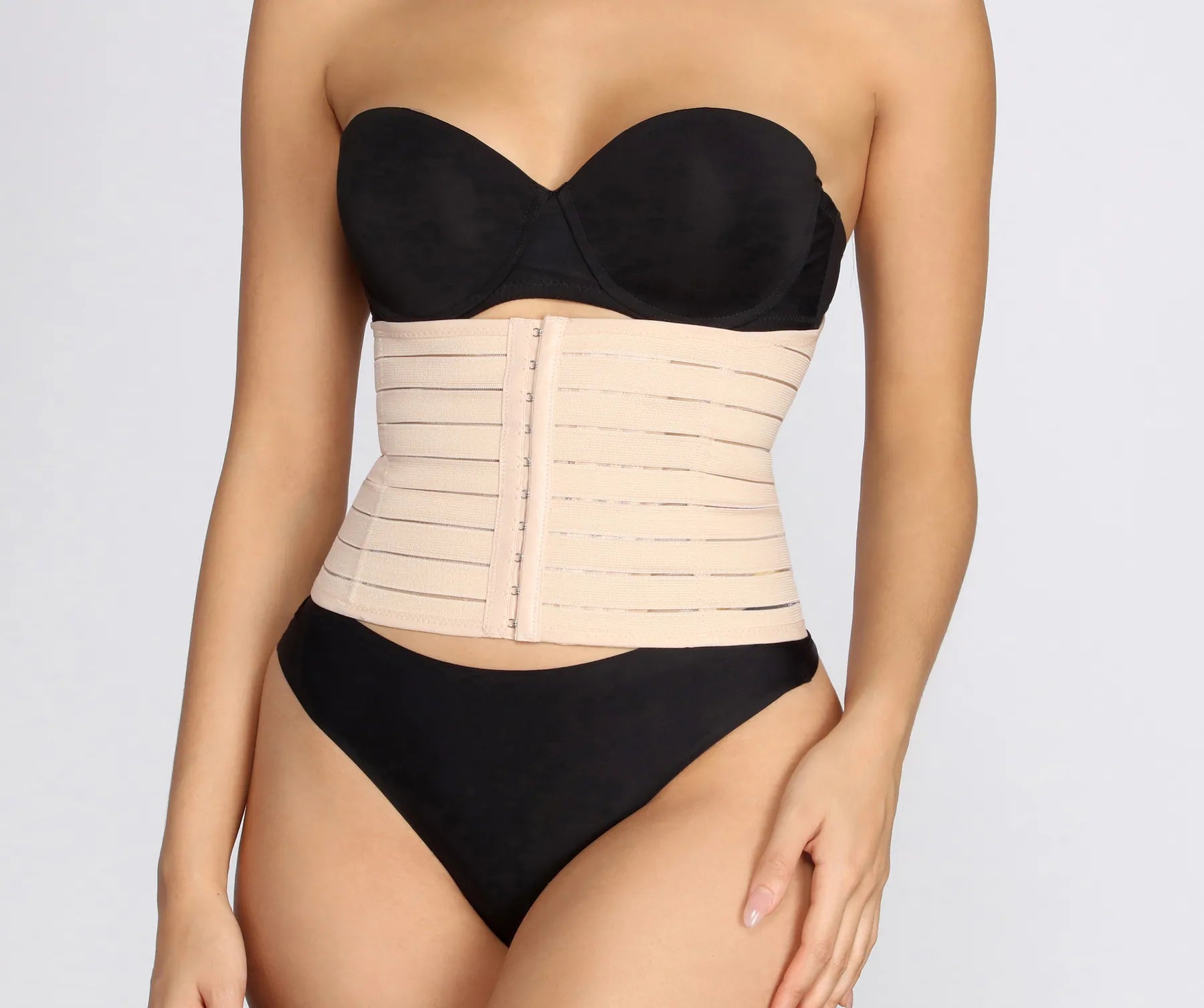 Help create a minimized waistline and midriff for an hourglass shape! Featuring built in stretch. and firm control with the 10 vertical rows of hook and eye closures and 6 horizontal adjustments. Designed with wired vertical boning. and composed of a stretchy bandage material. This waist cincher helps even out and smooth your body for a more sleek and slim look!