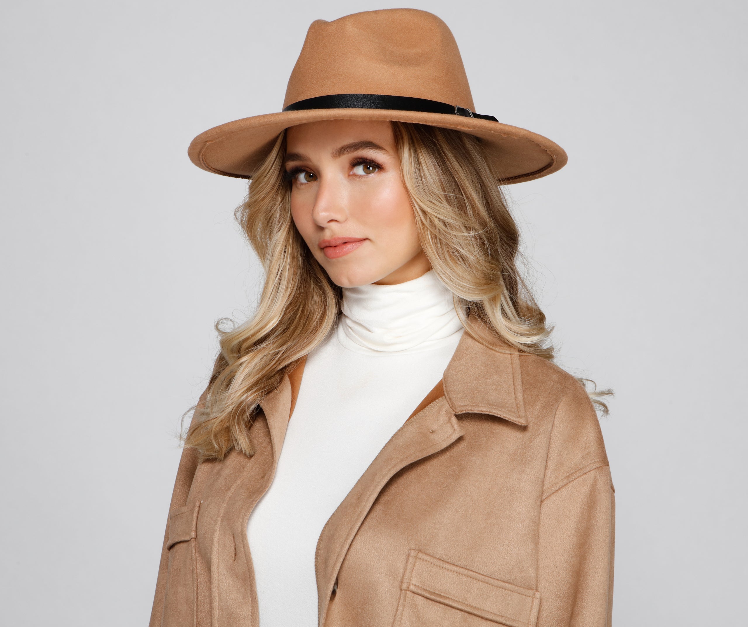 Channel a basic mood with a fab hat that adds that effortless touch to your look! The hat features a traditional Panama design. a short brim. a faux leather trim with a small buckle. The hat is composed of a faux wool material. Complete look with a and high waist jeans.?