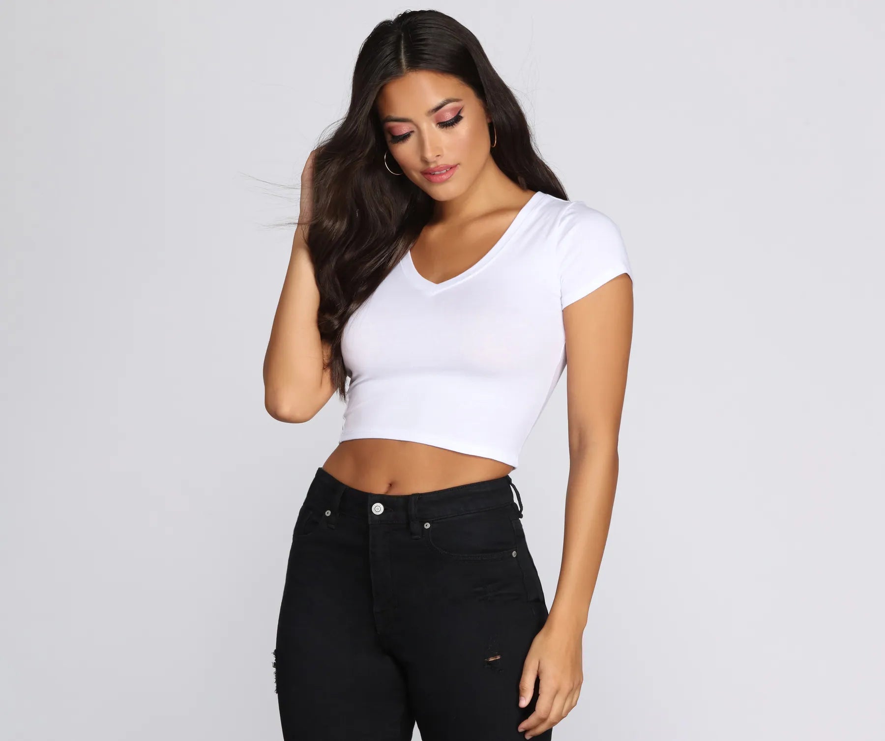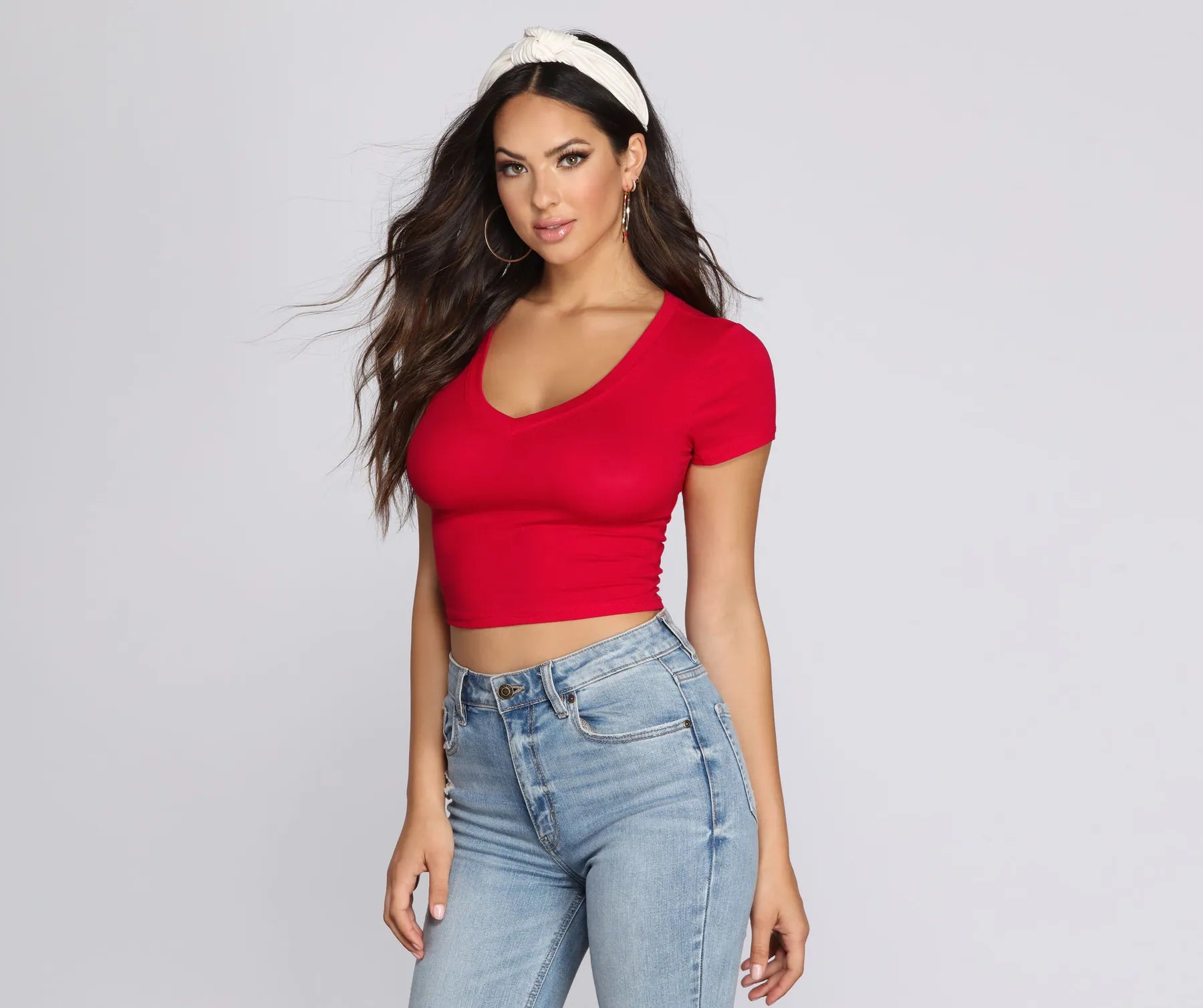 Its basically always a good time to add a staple basic piece to your closet. This tee features a deep V neckline. a quarter shoulder sleeve and a mid crop hem. The top is composed of a smooth cotton like fabric that offers a moderate stretch with a form fit.