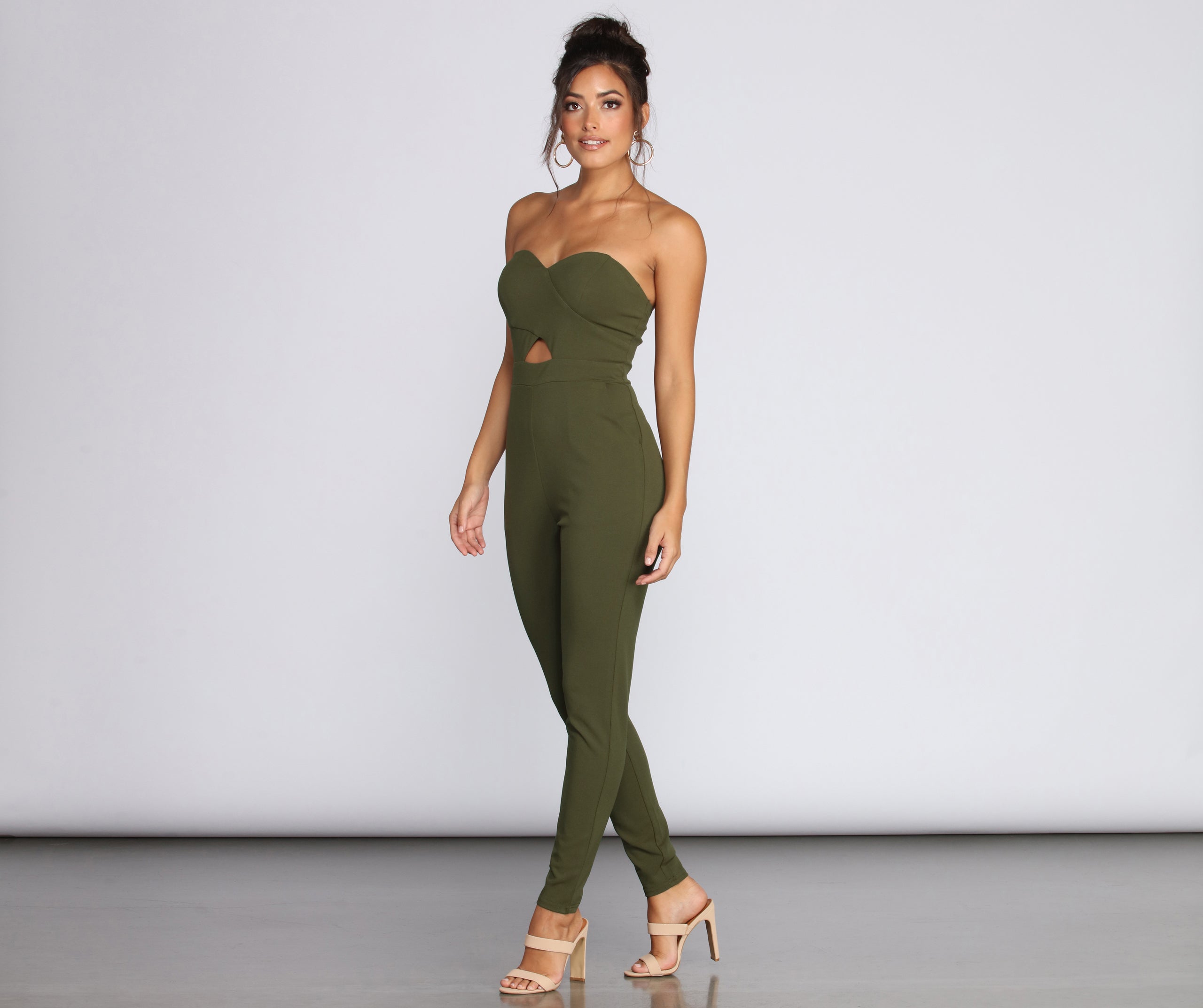 A little utilitarian and a lot chic. this crepe jumpsuit guarantees all eyes on you. The suit features a strapless sweetheart neckline. a seamed. lightly padded bodice with elasticized zippered back and cutout detail above the waist. pockets at either hip and legs that are slightly fuller through thigh and taper gently towards hems. The jumpsuit is made of lightweight woven material with modest stretch. Complete look with .