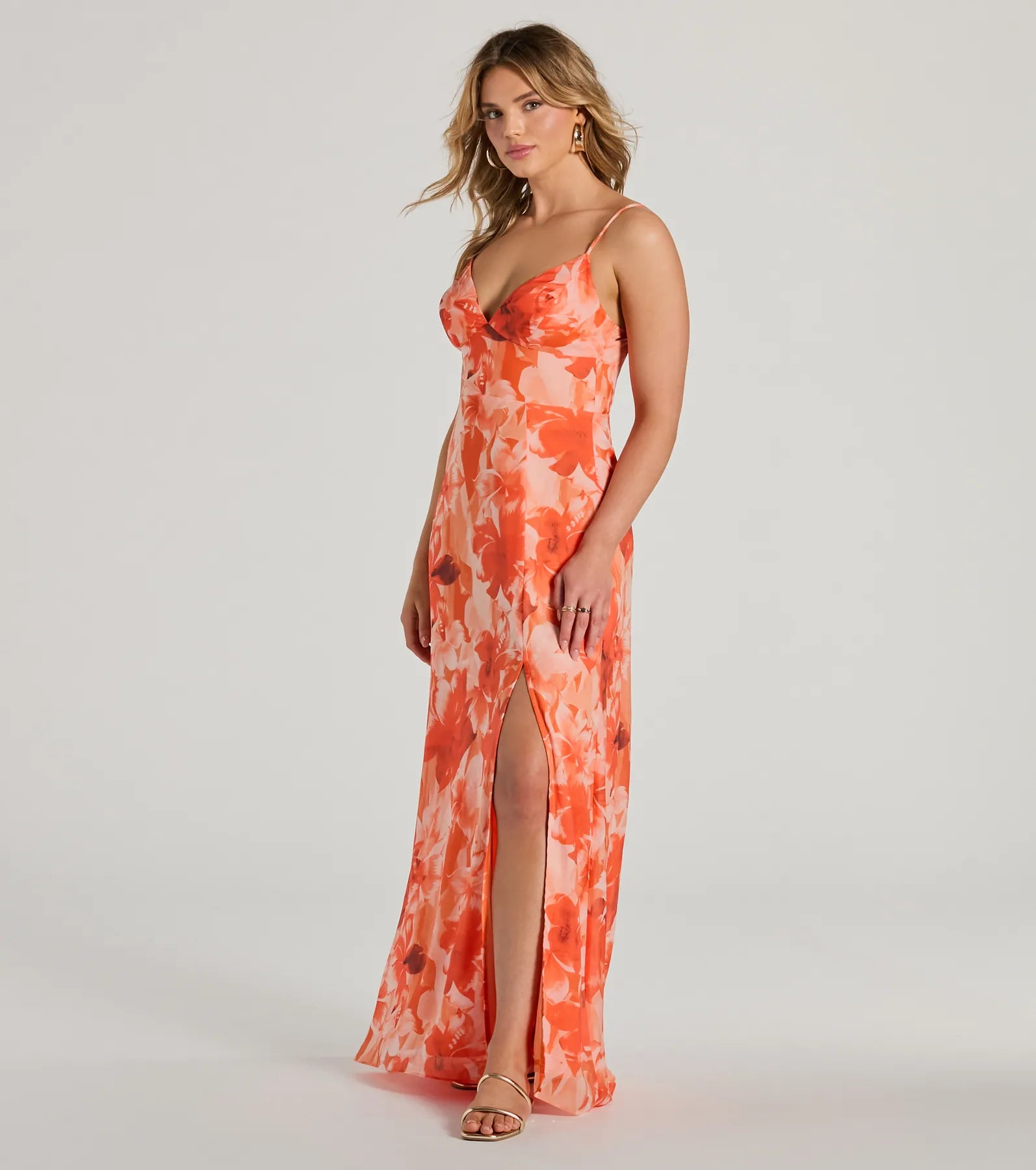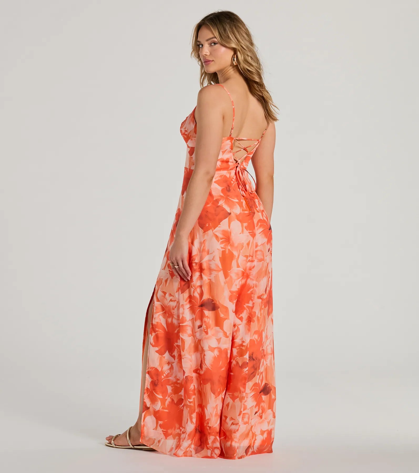Give off undeniable grace and beauty in this floral chiffon maxi dress on vacation or at parties! Featuring delicate adjustable spaghetti straps. a V-neckline. and a stunning lace-up back. this dress will accentuate your curves and create a flattering silhouette with a front slit and maxi-length hem. Complete the look in and earrings!