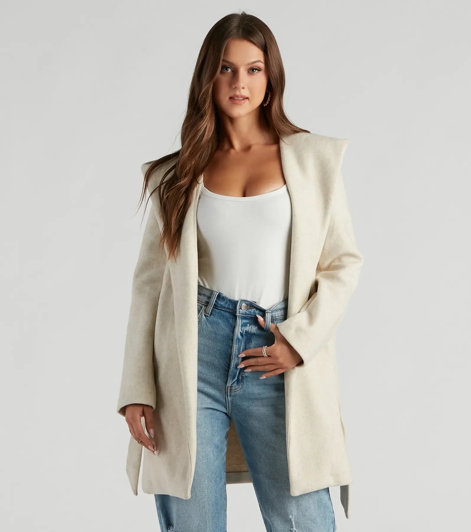 Layer on the sophistication with a coat that is perf for those moments you need to make a memorable first impression! The coat features a draped open front. oversized hood. long sleeves. a cinching tie waist belt with belt loops. hidden side pockets. and a knee-length. The coat is composed of a faux wool fabric that offers a relaxed fit with minimal stretch. Complete look with a cardigan and a .