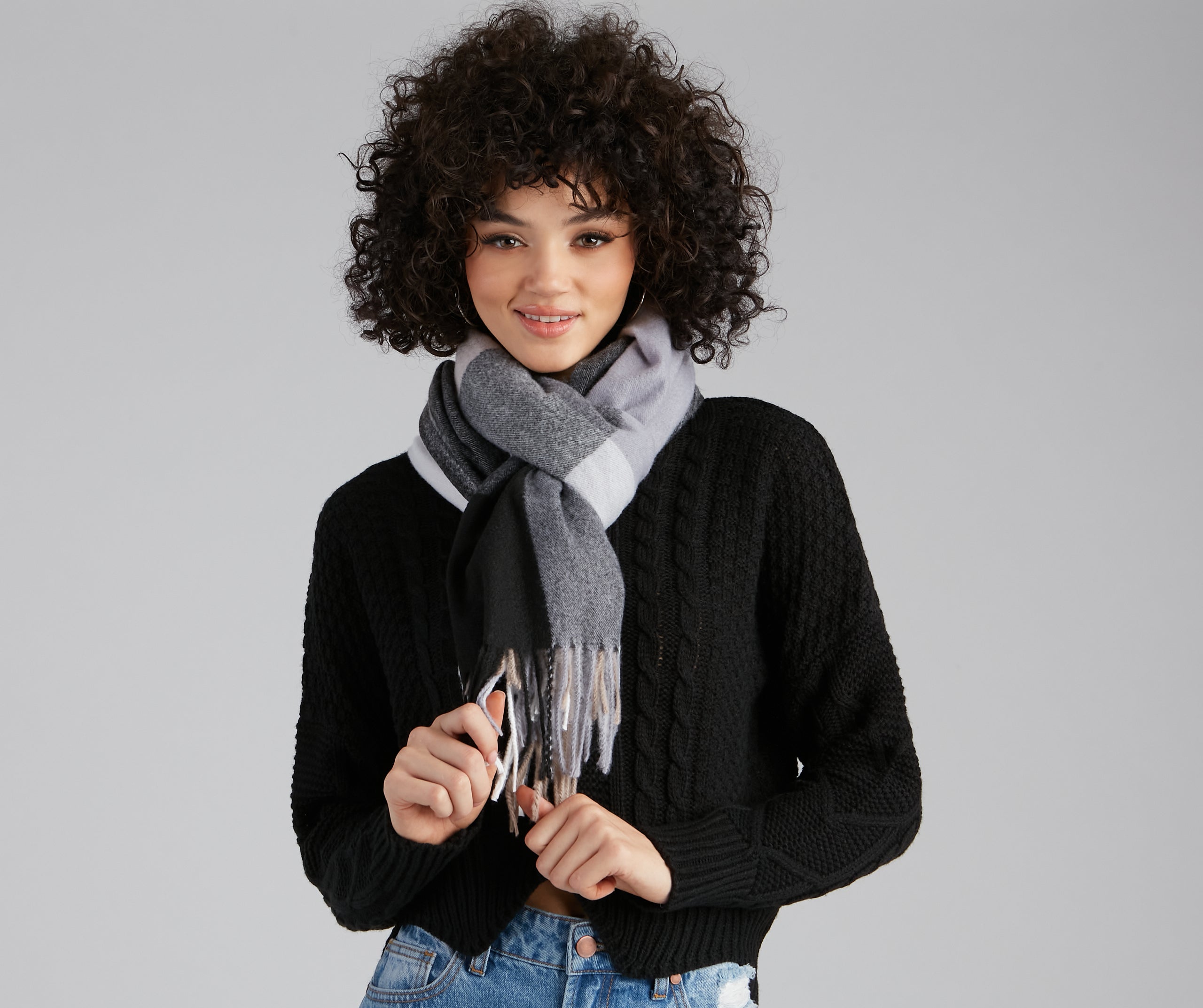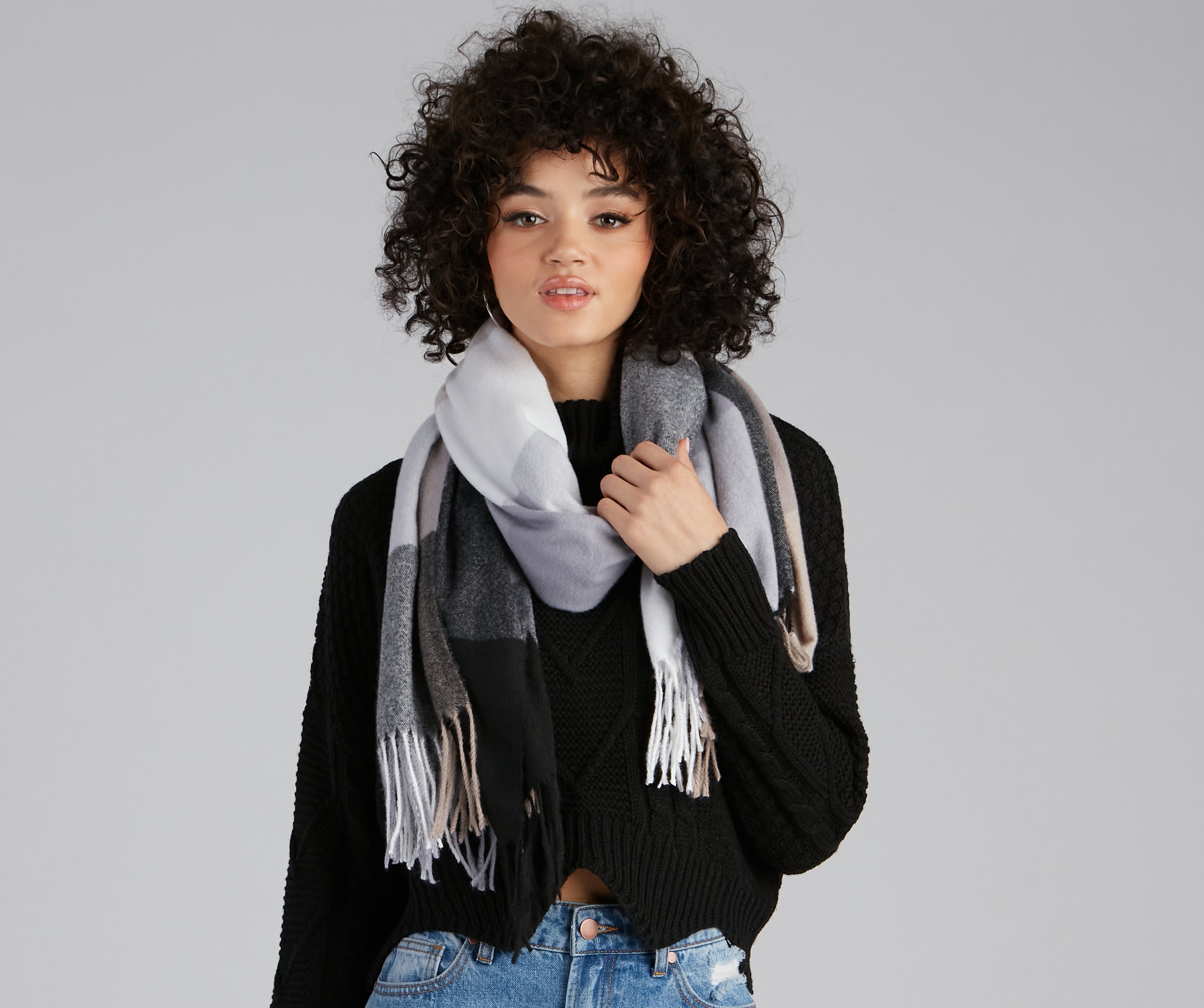 You’ll be so chic ib the city with this plaid fringe scarf. Composed of a brushed woven fabric. Perfect for styling with a and boots.