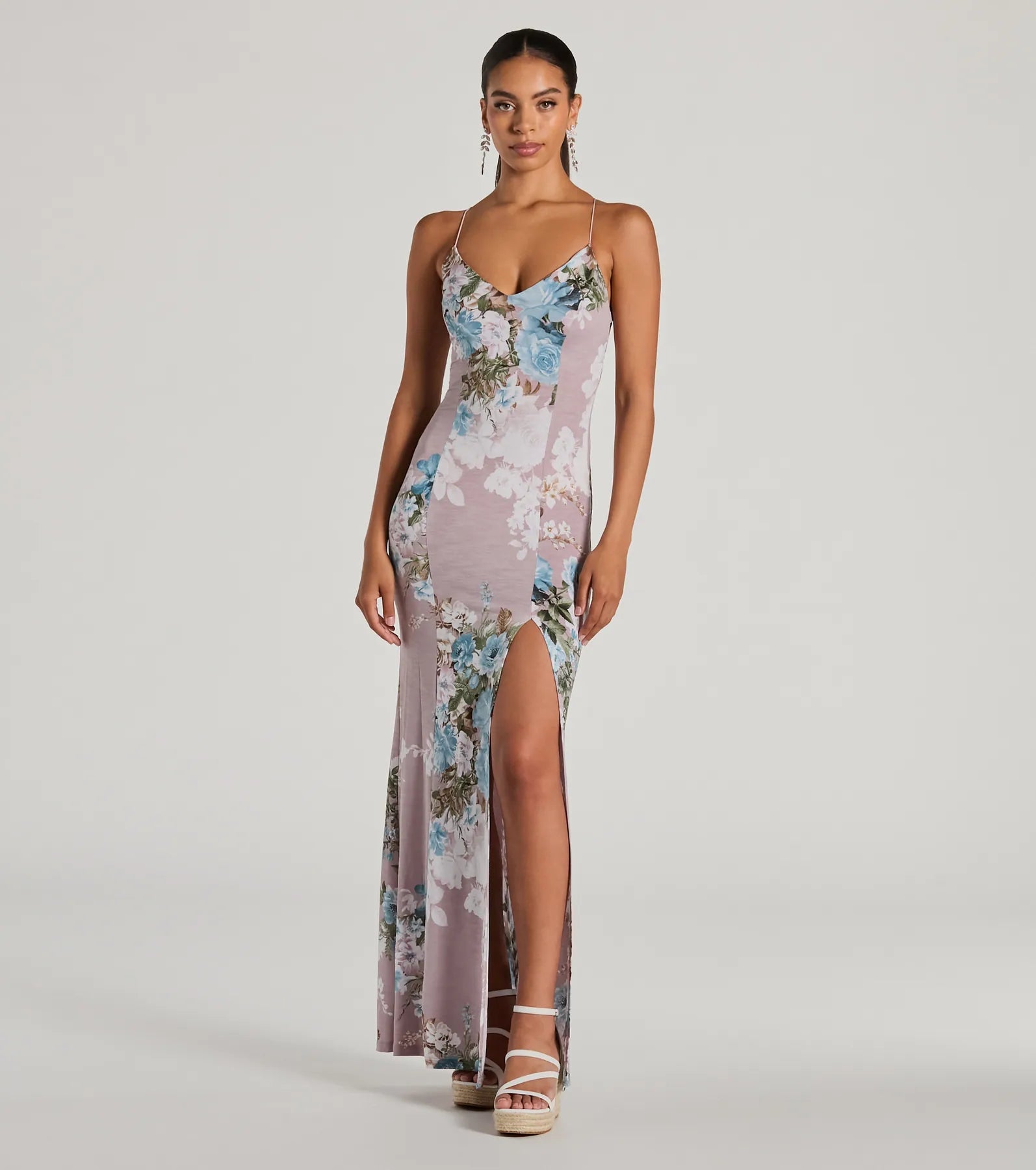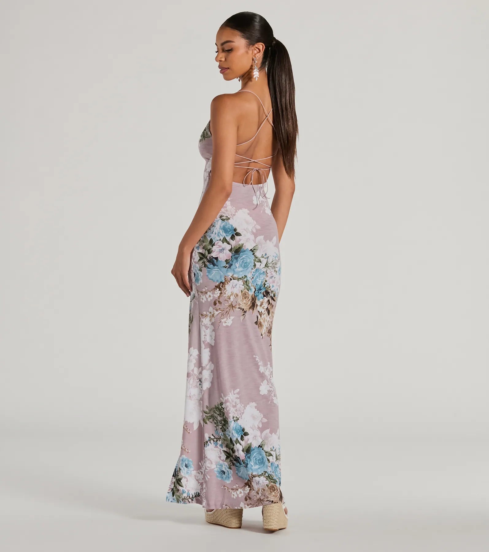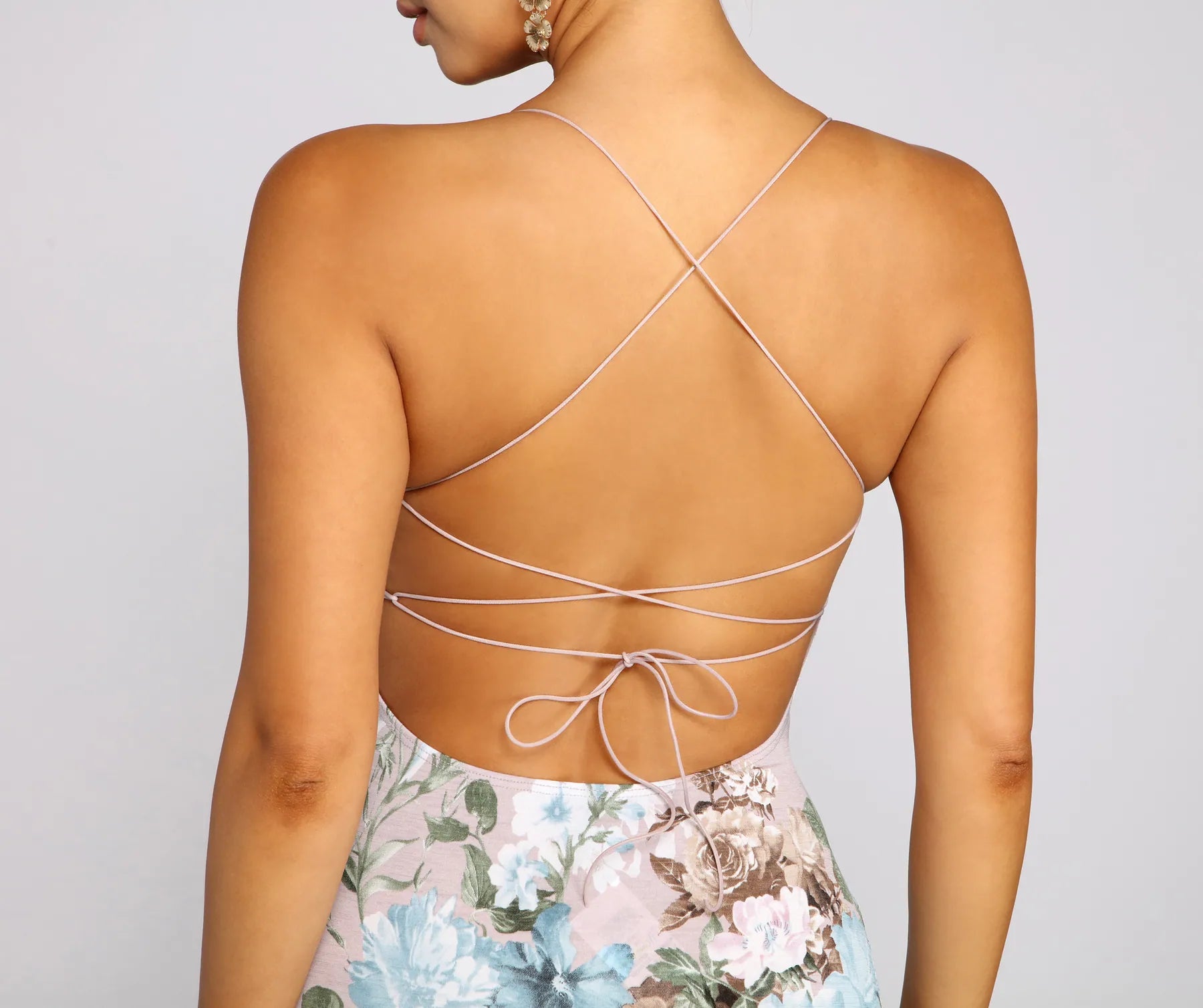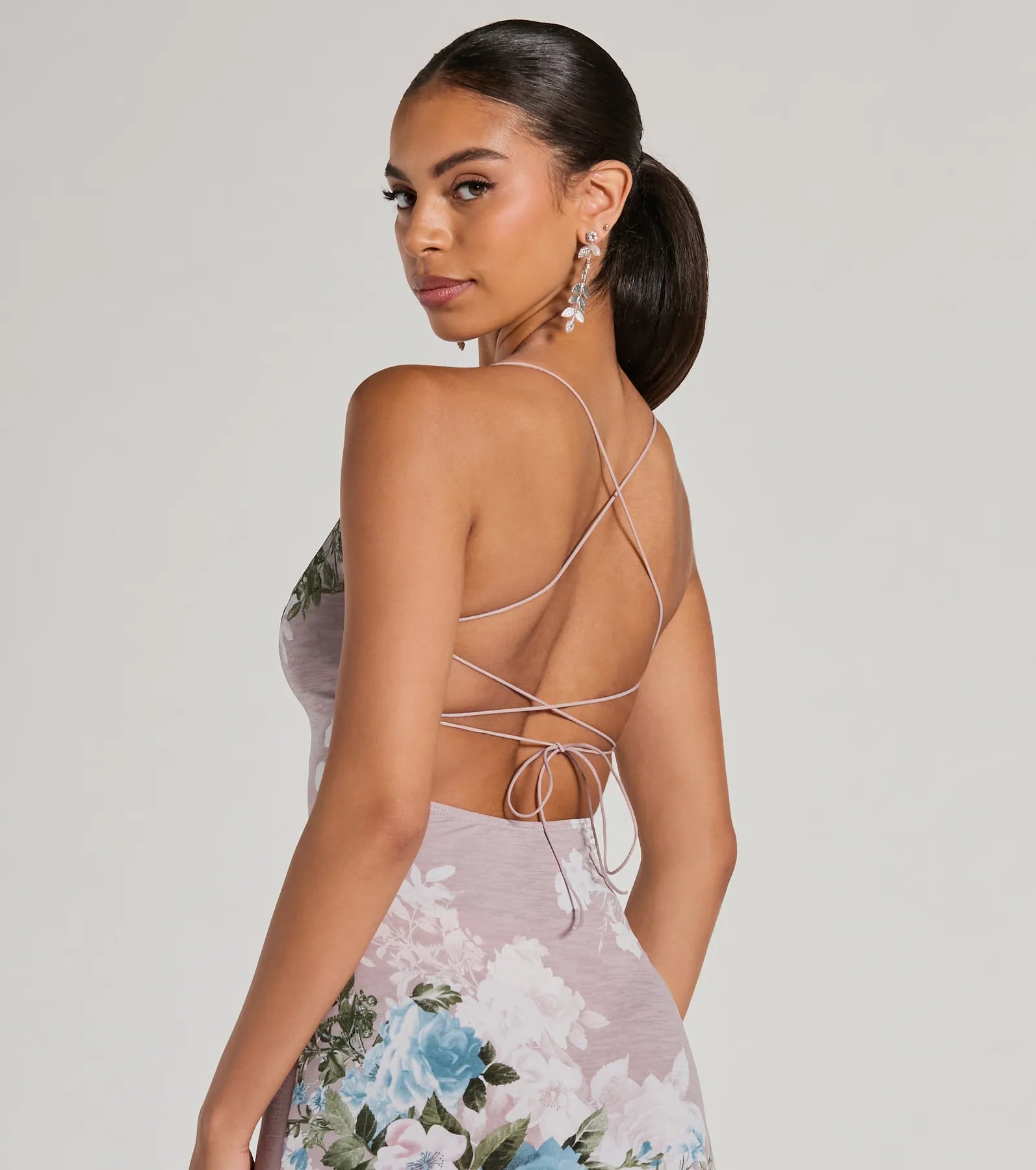 Showcase your beauty as the best-dressed wedding guest in this blooming floral knit maxi dress! Designed with a gorgeous floral print design. it features a sleeveless V-neckline. spaghetti straps that lead to a bold open back with a lace-up strappy design. a thigh-high front slit to show off your heels. and a slim-fit silhouette. Complete your look with sleek .