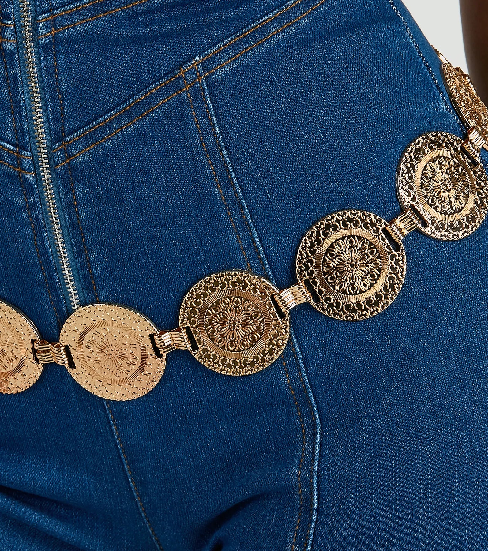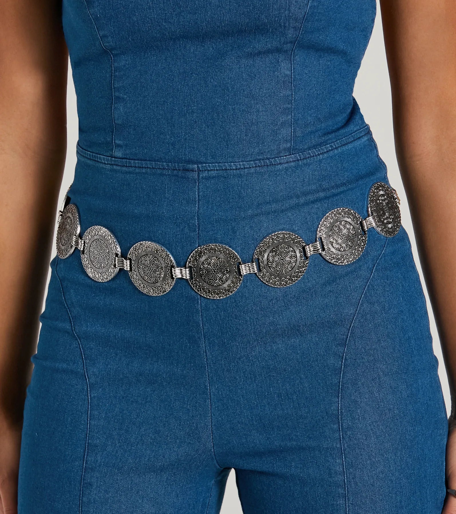 Add a touch of bohemian flair to your ‘fit with this sleek medallion chain belt! It features large circular medallions with an intricate engraved design and a back adjustable chain with a lobster clasp closure to find your perfect fit. Style over a with a crop top and sandals!