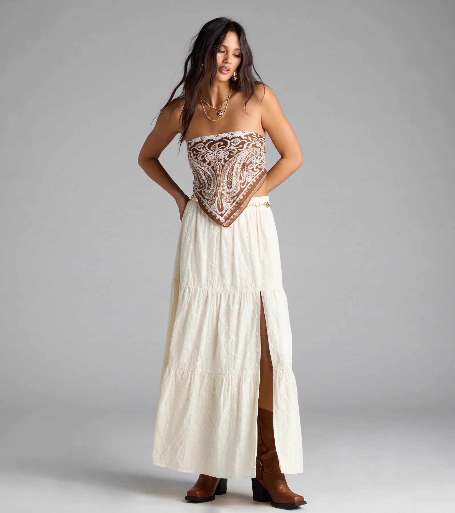 Show off a boho-chic vibe by accessorizing your ‘fits with this paisley knit scarf. Style as a headwrap. around your neck. as a trendy top. or accented on your bag!