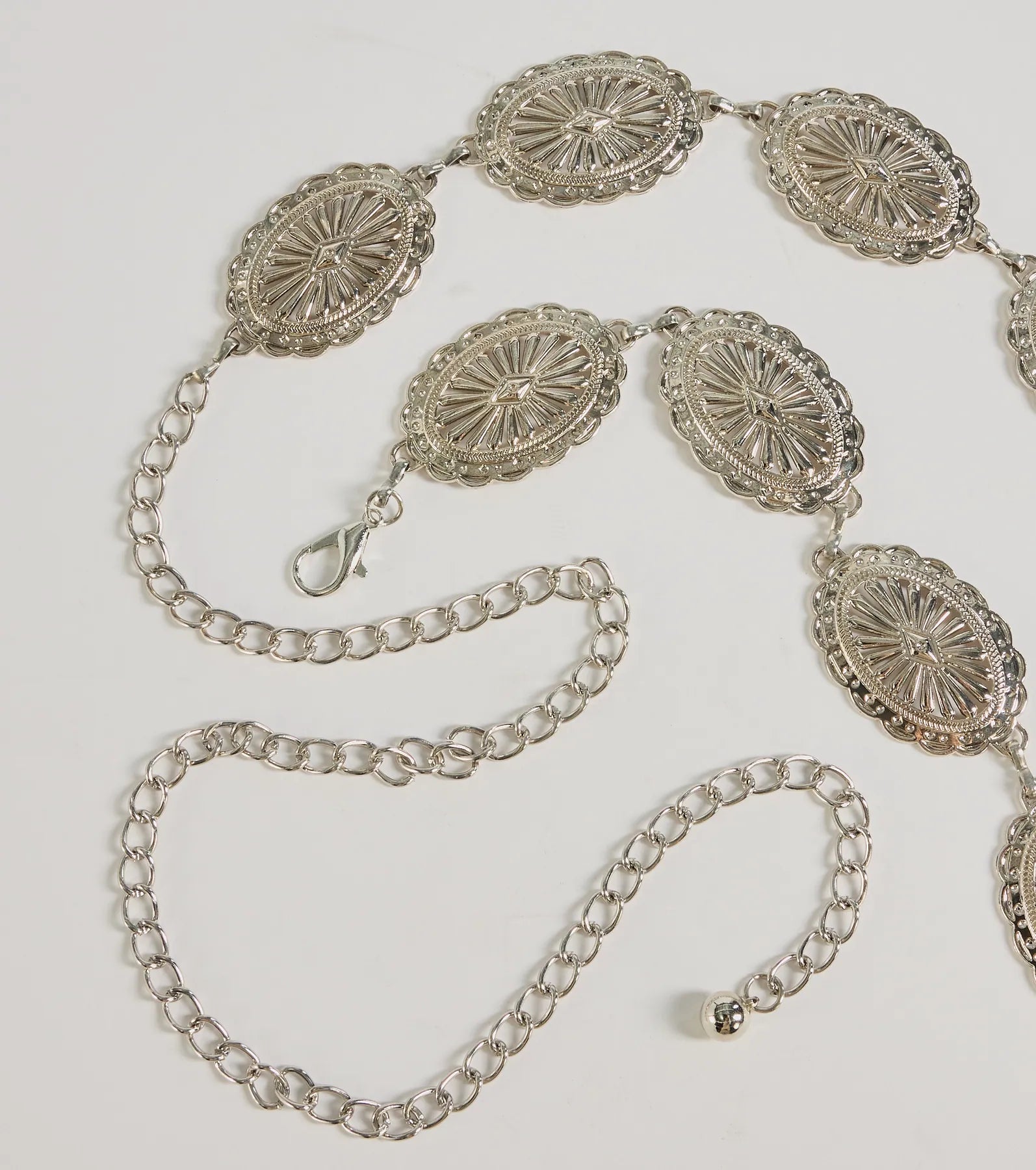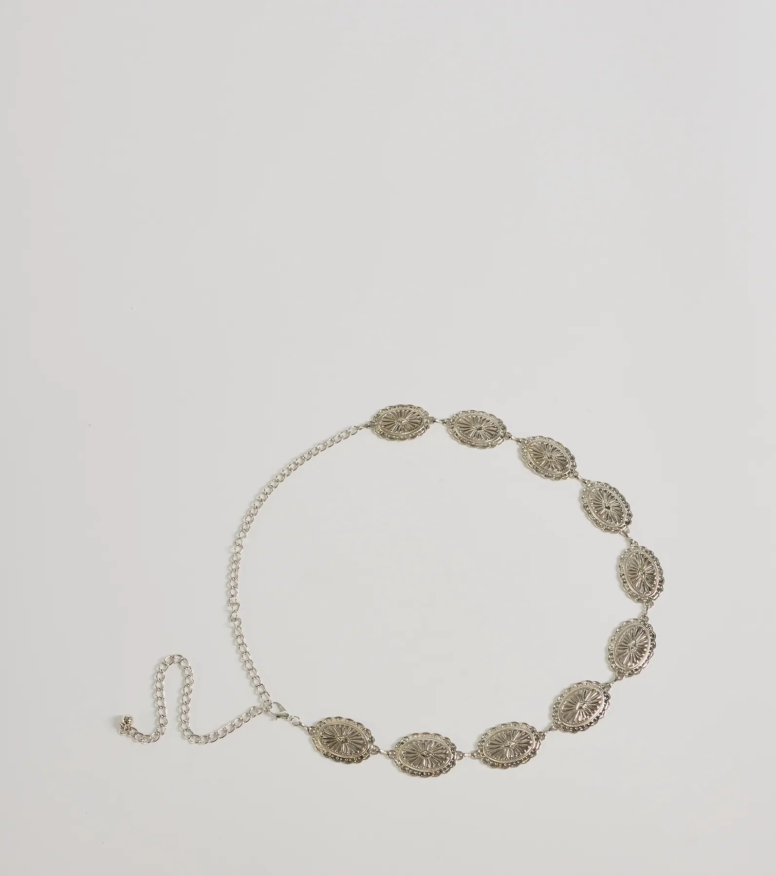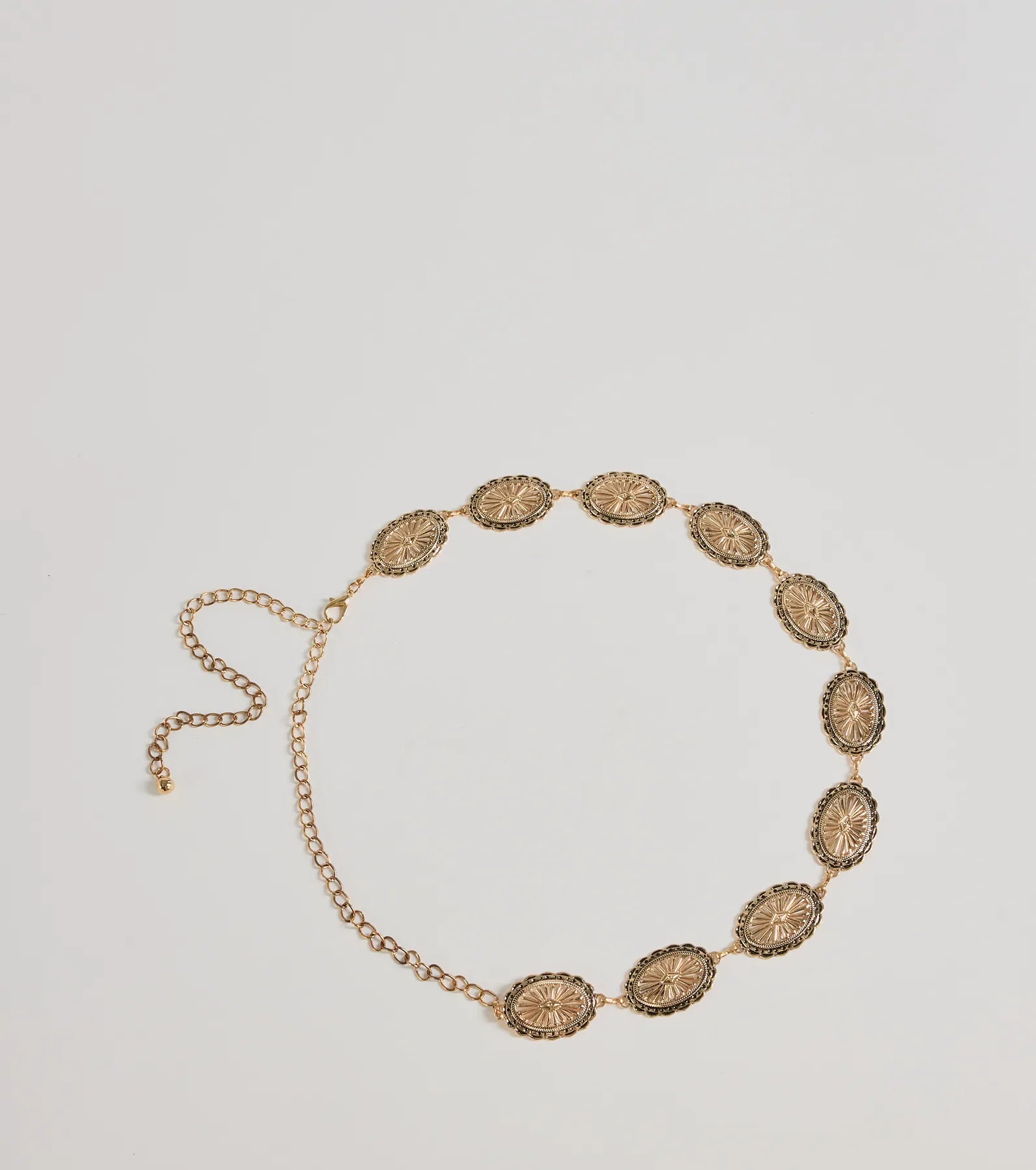 This trendy chain belt will add a boho western-chic flair to your look! It features oval-shaped accents with etched detailing and an adjustable chain with a lobster clasp closure. Style with and a crop top!