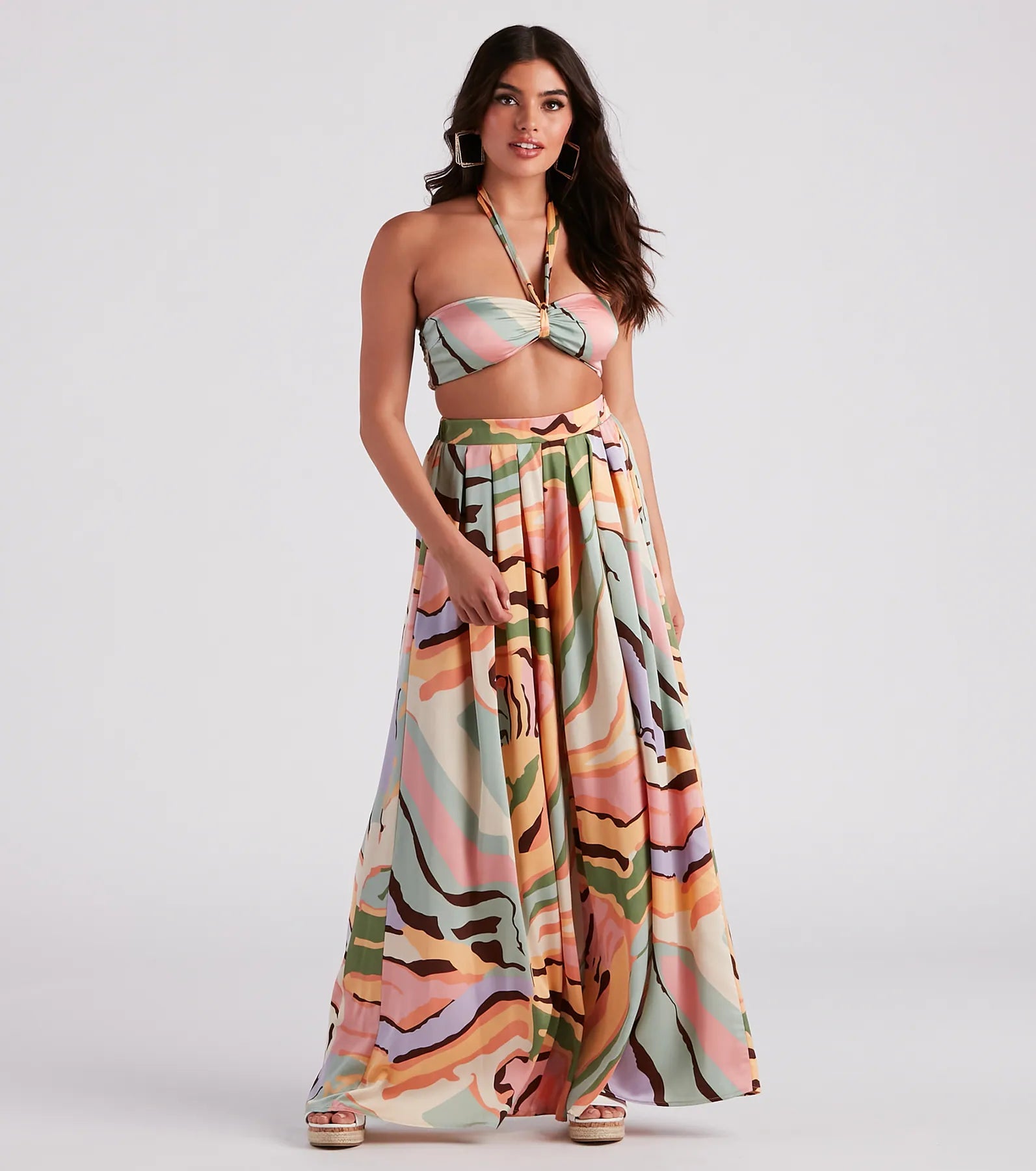 Bring the heat to your spring break look with this trendy crop top that will get everyone’s attention! It features a sleeveless sweetheart neckline with a padded bust. thin halter straps with multiple ways to style. a stretchy smocked back. an ultra-cropped hem. and a sassy abstract printed design. Style with the matching wide-leg pants to be vacay-ready!