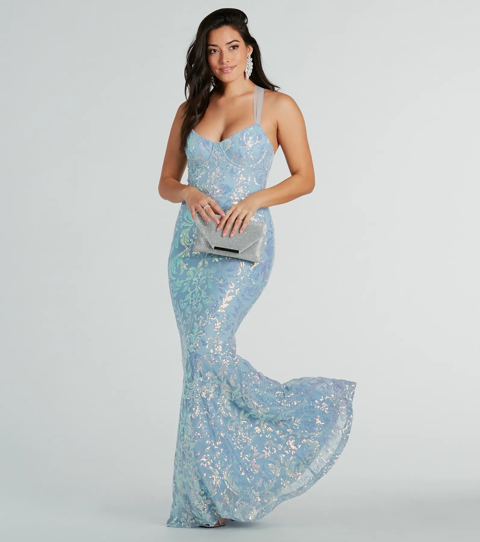 If you’re looking to shine and stand out. the Brooklyn sequin long formal dress is a fresh option for brides. prom. and black tie events! Crafted with a sequin-scroll pattern on mesh fabric. this formal gown will leave everyone speechless with its sparkle. The sweetheart neckline and bustier bodice provide a flattering silhouette. while padded underwire bra cups and flexible boning offer enhanced support. Tulle straps and a lace-up back add a touch of delicacy. making this dress perfect for any formal occasion. Complete the look with grand for a flawless finish!