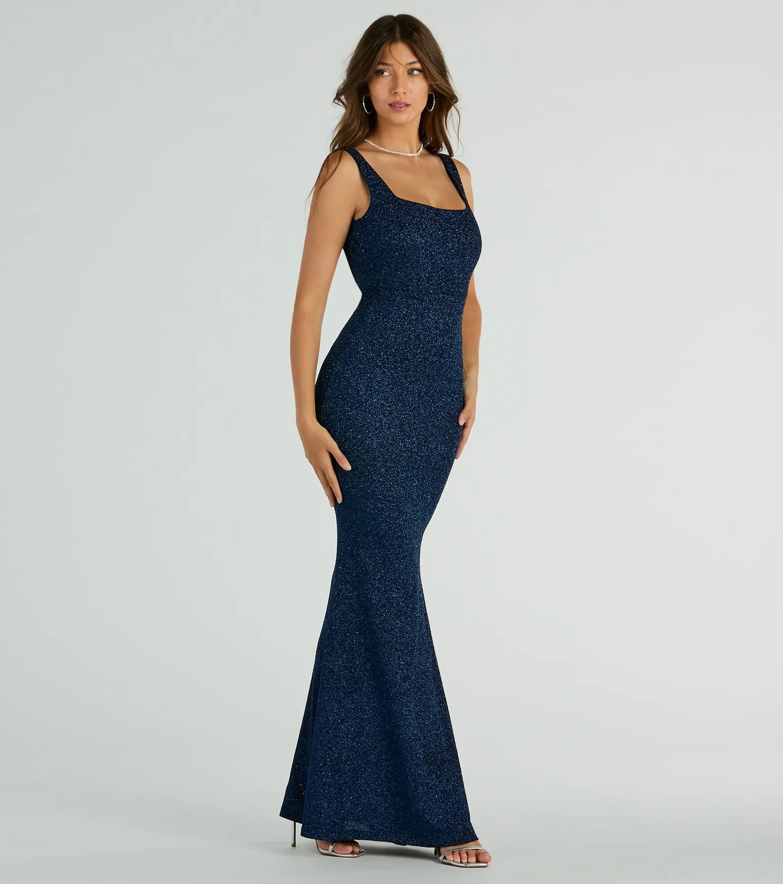 Elevate your night looking beautifully decadent in the Cadence glitter formal dress perfect for black tie galas or celebrations! Crafted from glitter knit fabric. this floor-length dress features a square neckline. tank shoulder straps. and a low square cut back. Its mermaid silhouette accentuates your curves. making it a perfect choice for formal events. Complete the look with .