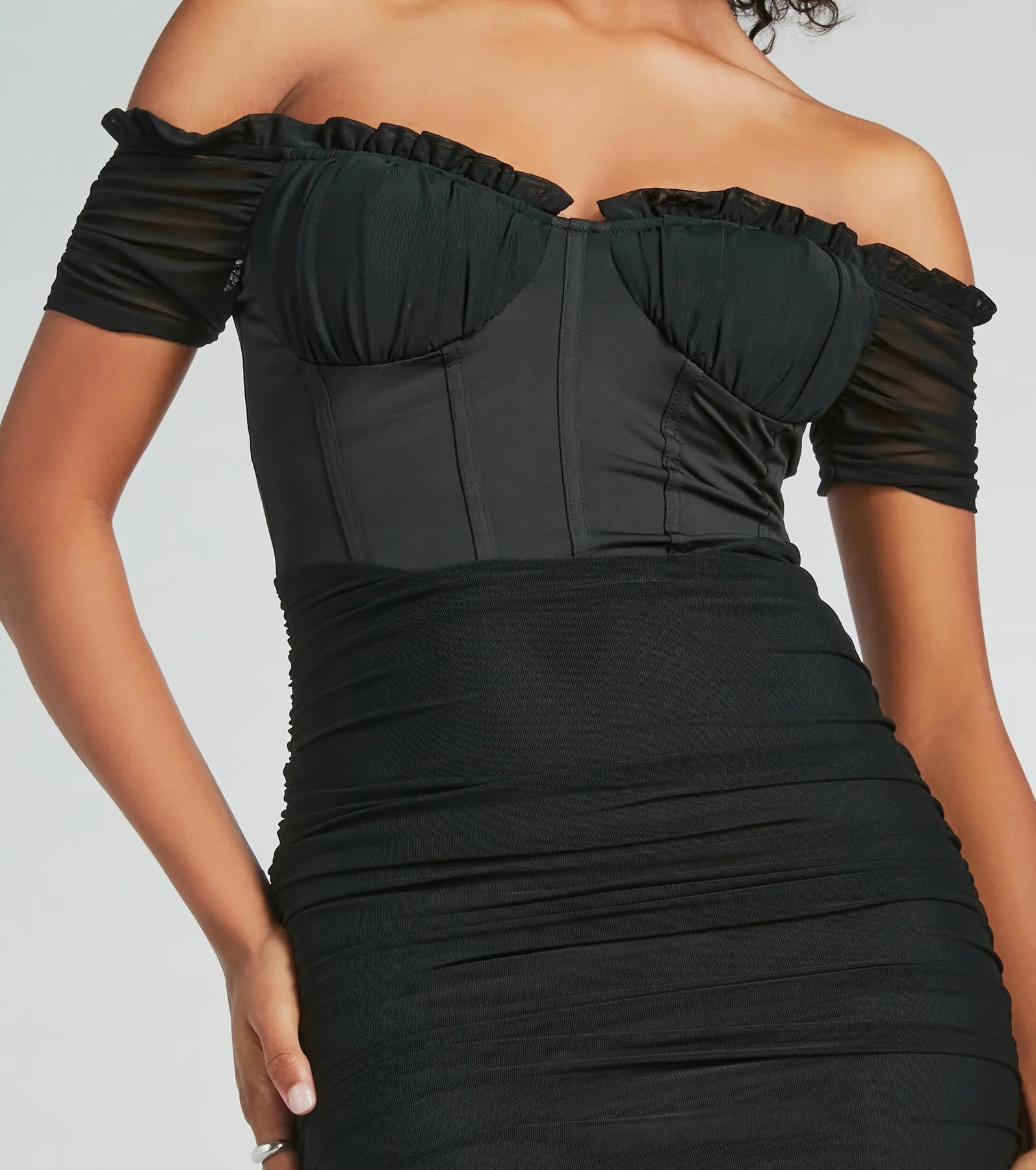 Girl. you can’t help but pull off this off-the-shoulder mini dress at the club! Featuring a ruffled sweetheart neckline. padded bra cups for support. short-sleeve cuffs. and a bodycon fit. this dress will show off your curves while keeping you comfortable in a mini-length hem. Complete the look in edgy .