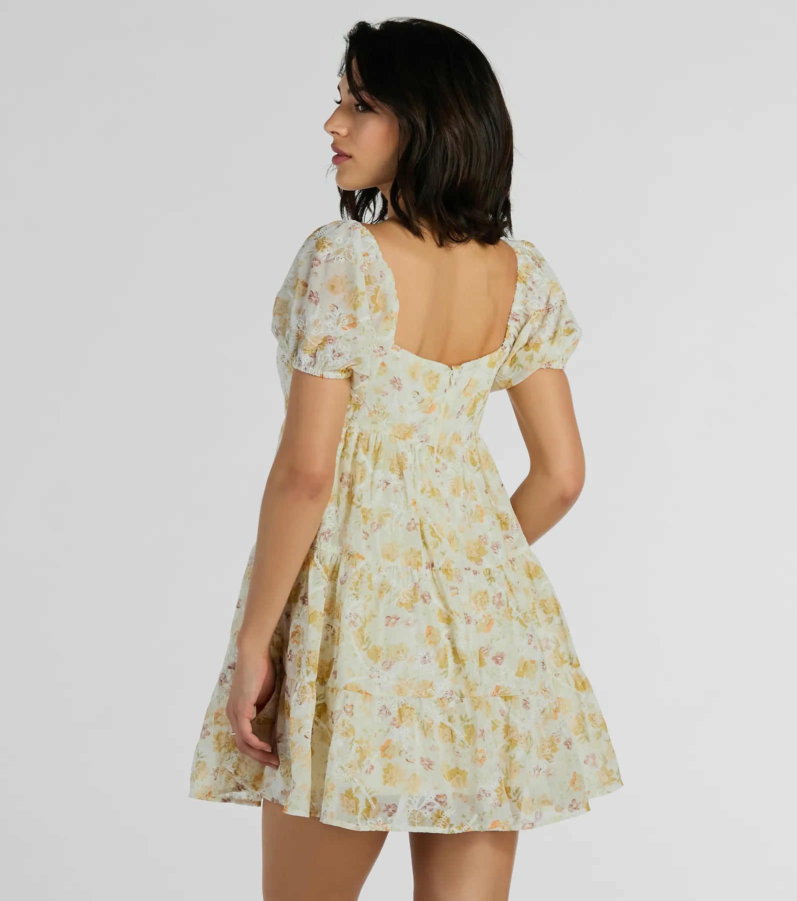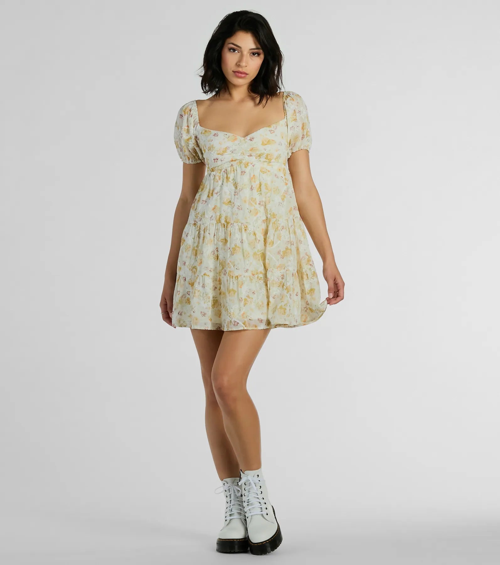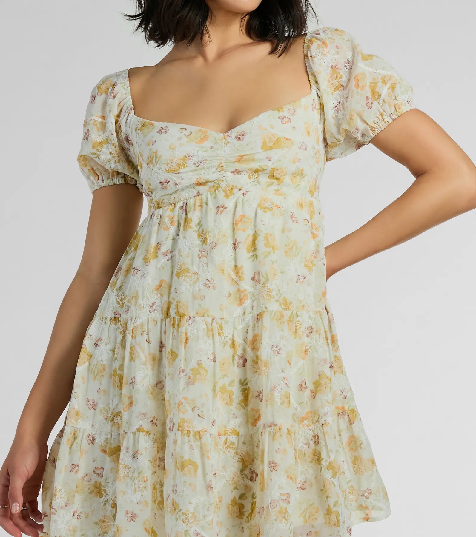 Captivate everyone with your cuteness in this eyelet floral babydoll dress at parties or brunch! Made with delicate eyelet floral chiffon fabric. this dress is perfect for any occasion. The puff short sleeves and V-neckline add a touch of playfulness. while the babydoll silhouette and tiered ruffled hem offer a flattering fit. Complete the look in edgy .