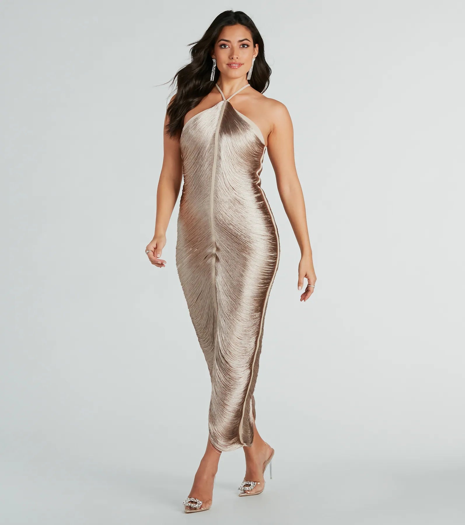 Old Hollywood with flapper flair. the Carolina formal fringe maxi dress sways with every move you make! She brings modern glamour with her sleeveless high neckline. spaghetti halter straps. a form-hugging silhouette. and a curved long-length hem. The formal maxi dress is designed with fringe detailing throughout a smooth knit fabric that enhances your curves and adds some drama to the night. Complete the look with for a cocktail party or banquet!