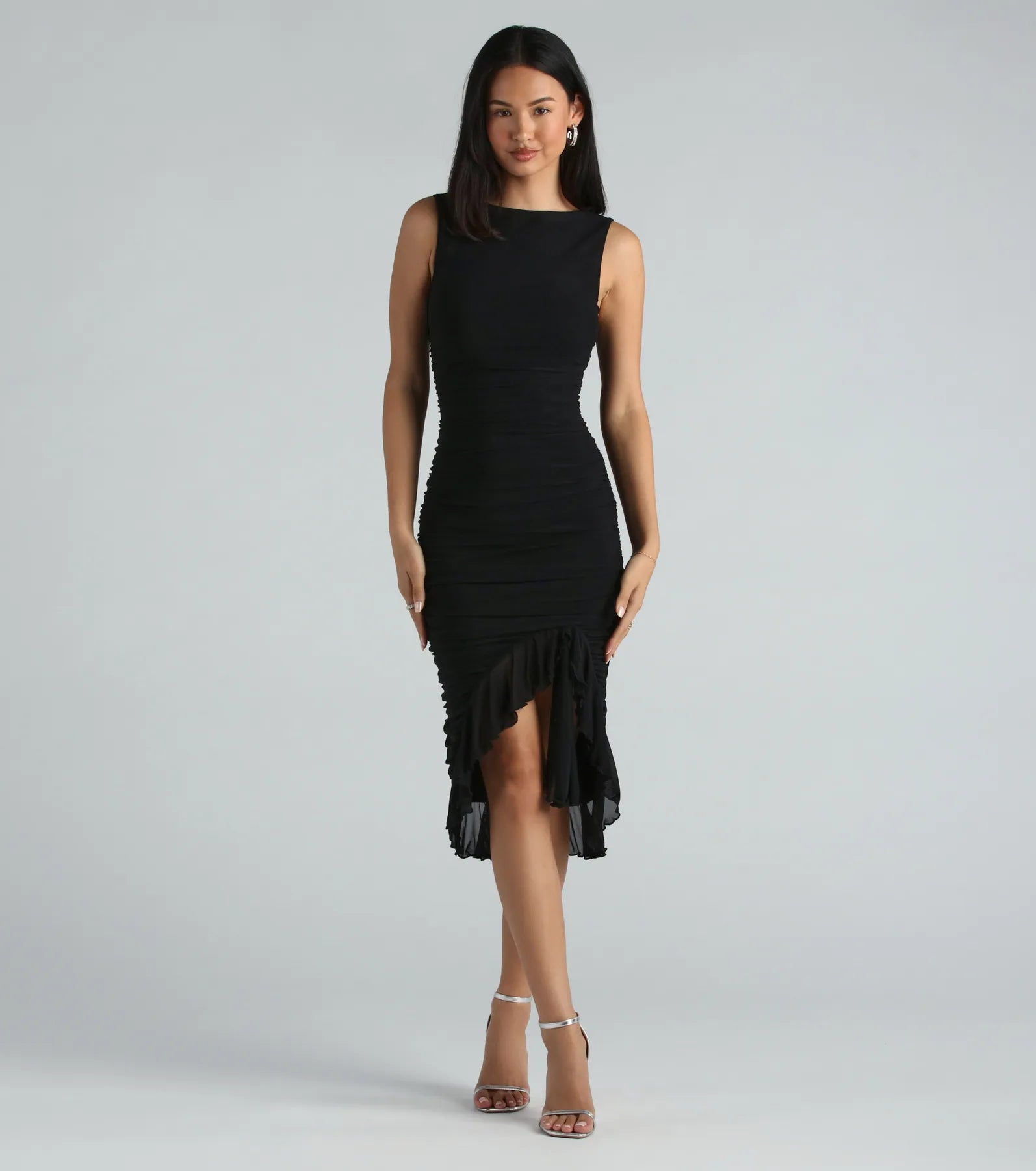 The Casey formal mesh dress will have you looking tasteful and elegant for banquets or rehearsal dinners! She features a sleeveless high neckline. a square-cut back. side. and back ruching to accentuate your gorgeous curves. a bodycon silhouette. and a playful surplice ruffled midi-length hem. The formal dress is crafted from a sheer mesh fabric with a sewn-in knit lining and plenty of stretch. Complete the look with earrings and .