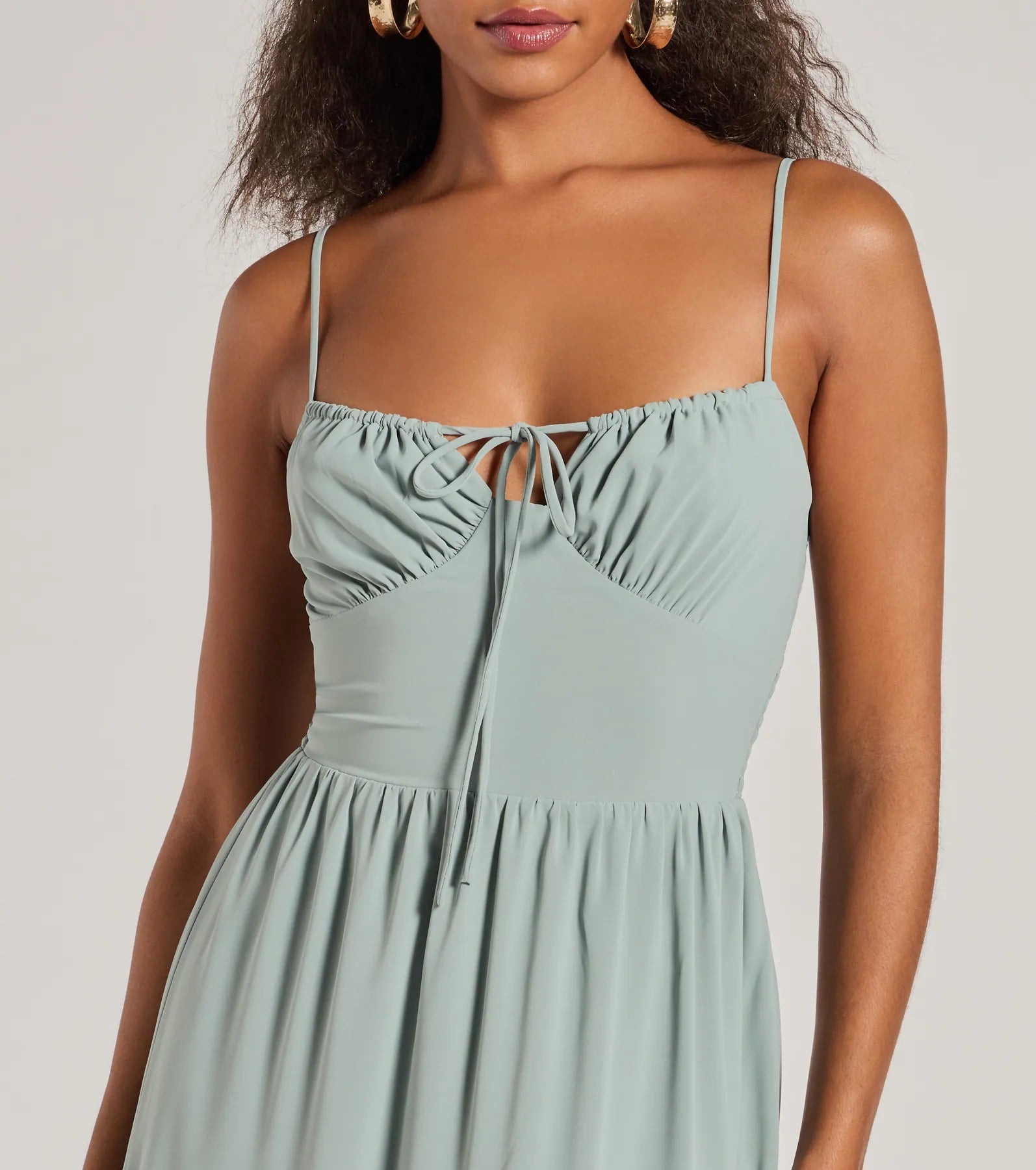 A casually chic sleeveless maxi dress with dreamy warm weather vibes. a flirty bust tie. and a flowy. ruffled silhouette!
