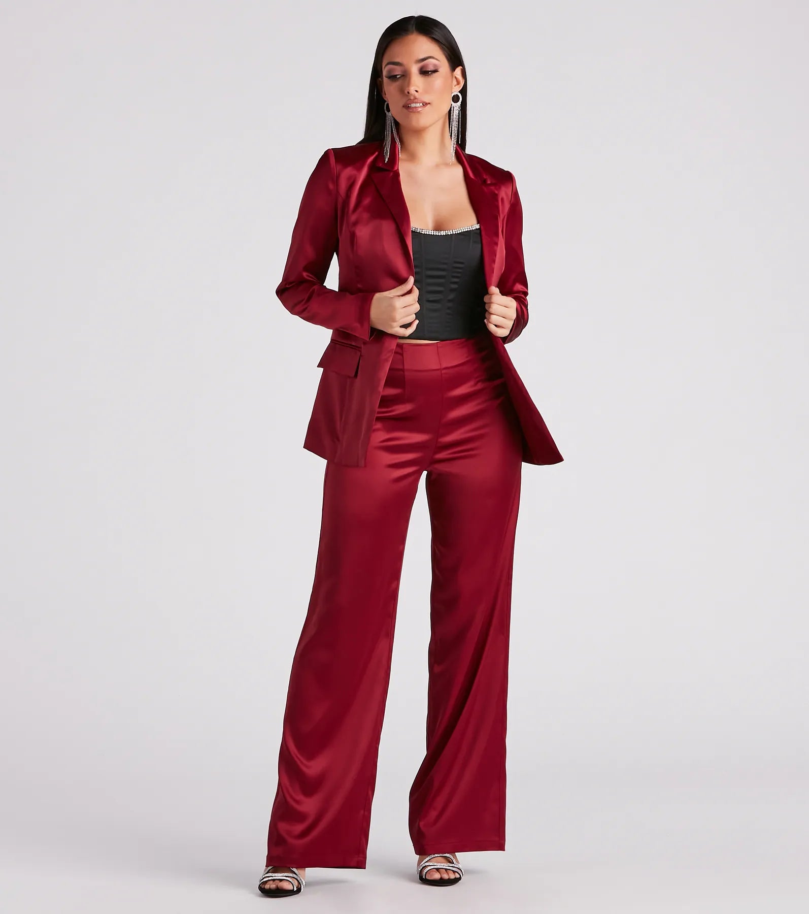 A cause for this rhinestone trim bustier is pop-the-bottle worthy! It features a strapless neckline. flexible boning inserts. and back hook-eye closures. composed of satin woven fabric. Complete the look in for a night out.